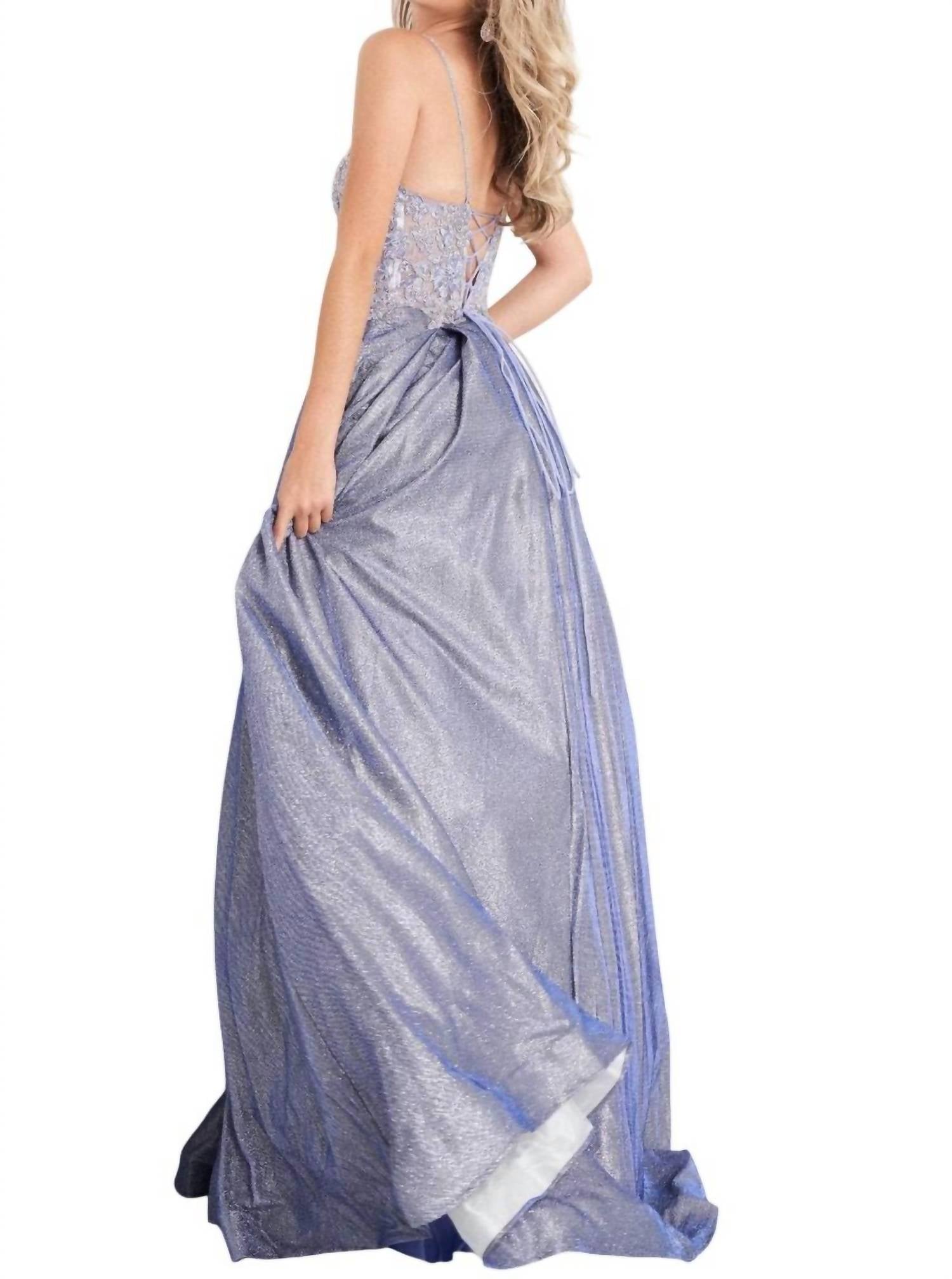 Basta adicionar uma linda clutch e um salto combinando para o look perfeito para o evento. Apresentamos o vestido de festa JOVANI com decote em V e bordado floral, uma escolha deslumbrante para o seu próximo baile de formatura. Com delicadas alças finas e um corpete justo e elegante, este vestido apresenta um bordado floral requintado. A silhueta do vestido de festa em azul-pervinca ostenta uma saia plissada com cauda longa, complementando as costas abertas com fecho de amarração.