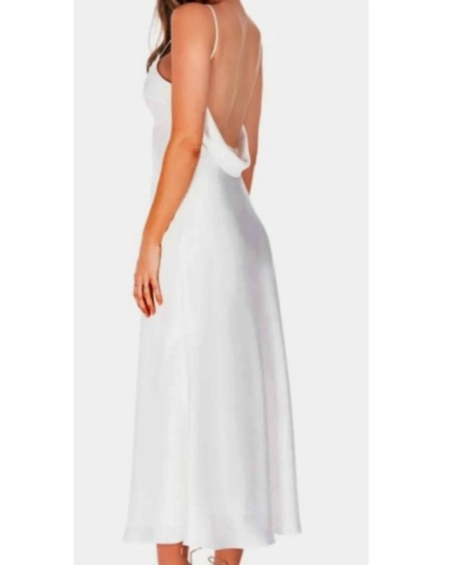 The perfect length dress does exist. Embrace elegance and sophistication with the Jessica Midi Dress by Katie May, crafted in a timeless ivory hue. This sleeveless dress, featuring a draped back detail and V-neck, combines 100% polyester and nylon for a luxurious feel. It's made in the USA and designed with a fully lined interior and a hidden side zipper closure for a sleek finish. The midweight satin fabric with lace trim completes the look, and it's essential that you dry clean only to maintain its pristine condition.