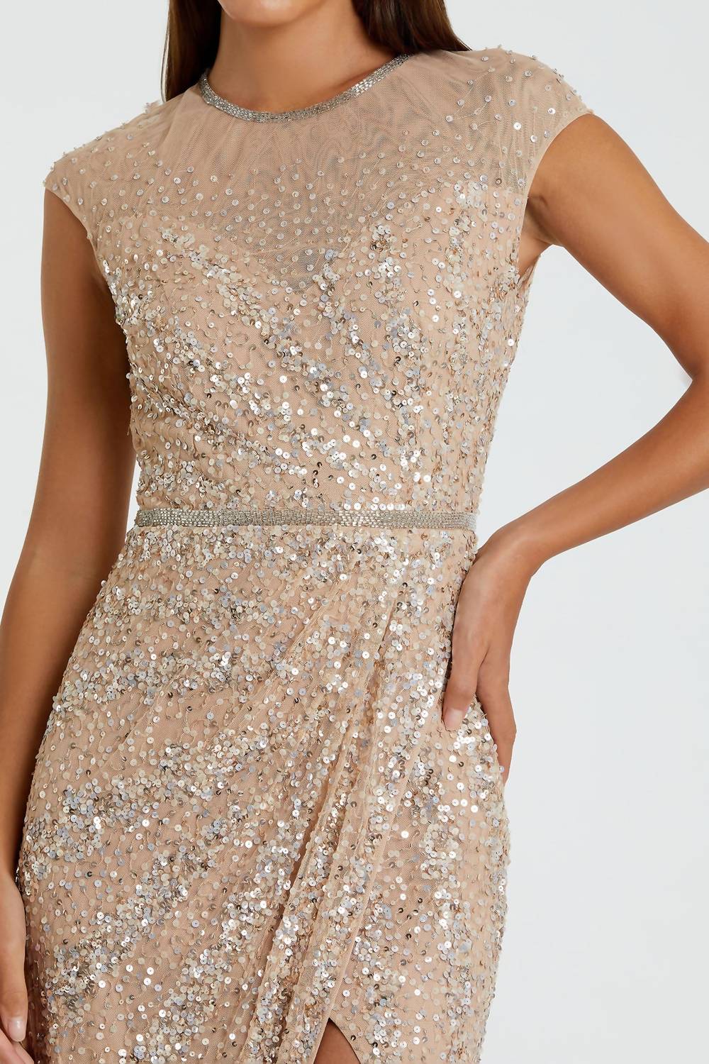 Experimente a elegância do Vestido de Gola Alta com Mangas Curtas e Estampa Ilusão Embelezada da Mac Duggal, com um design sem mangas e sobreposição em malha bordada à mão. Confeccionado em 100% poliéster, este deslumbrante vestido longo apresenta gola careca e fecho de zíper invisível para um acabamento impecável. Destacado por sua estampa texturizada, o vestido tem uma fenda frontal marcante na altura da coxa, medindo aproximadamente 162 cm do ombro à bainha. Perfeito para eventos noturnos, ele remete às tendências da moda dos anos 90 com um toque moderno.