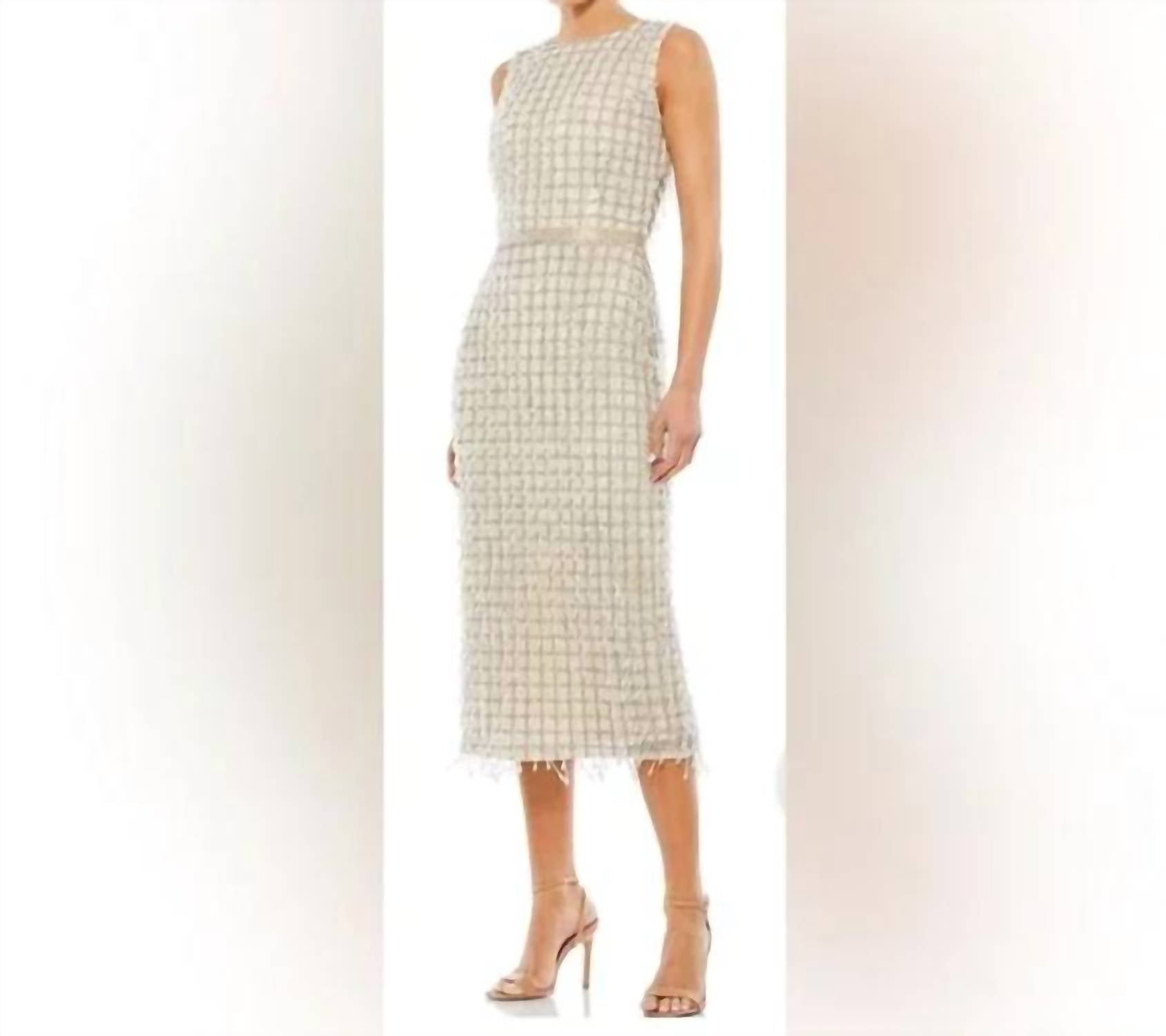 Basta adicionar slides ou mules e pronto. Apresentamos o Vestido Curto sem Mangas com Gola Alta e Contas da MAC DUGGAL, uma escolha refinada para ocasiões chiques. Abrace a elegância com seu design sem mangas e o requintado tecido com contas, oferecendo um toque de sofisticação. Confeccionado em 100% poliéster e com comprimento midi e fenda nas costas, este vestido é perfeito para coquetéis. Fechamento: Fecho de zíper. Cuidados: Limpeza com pano seco ou com um pano úmido. Comprimento aproximado do ombro à bainha: 122 cm. Disponível na versátil cor Nude.