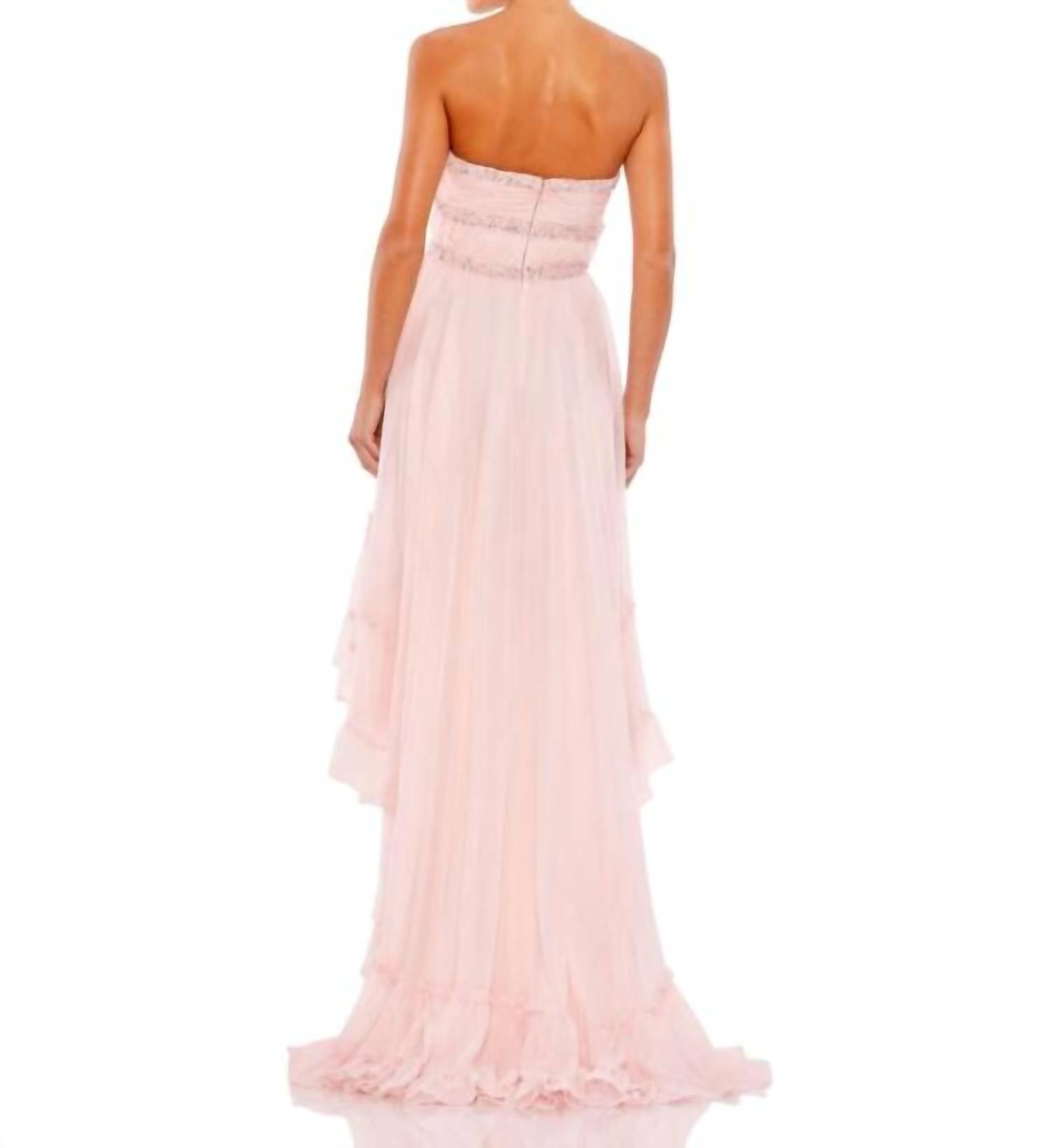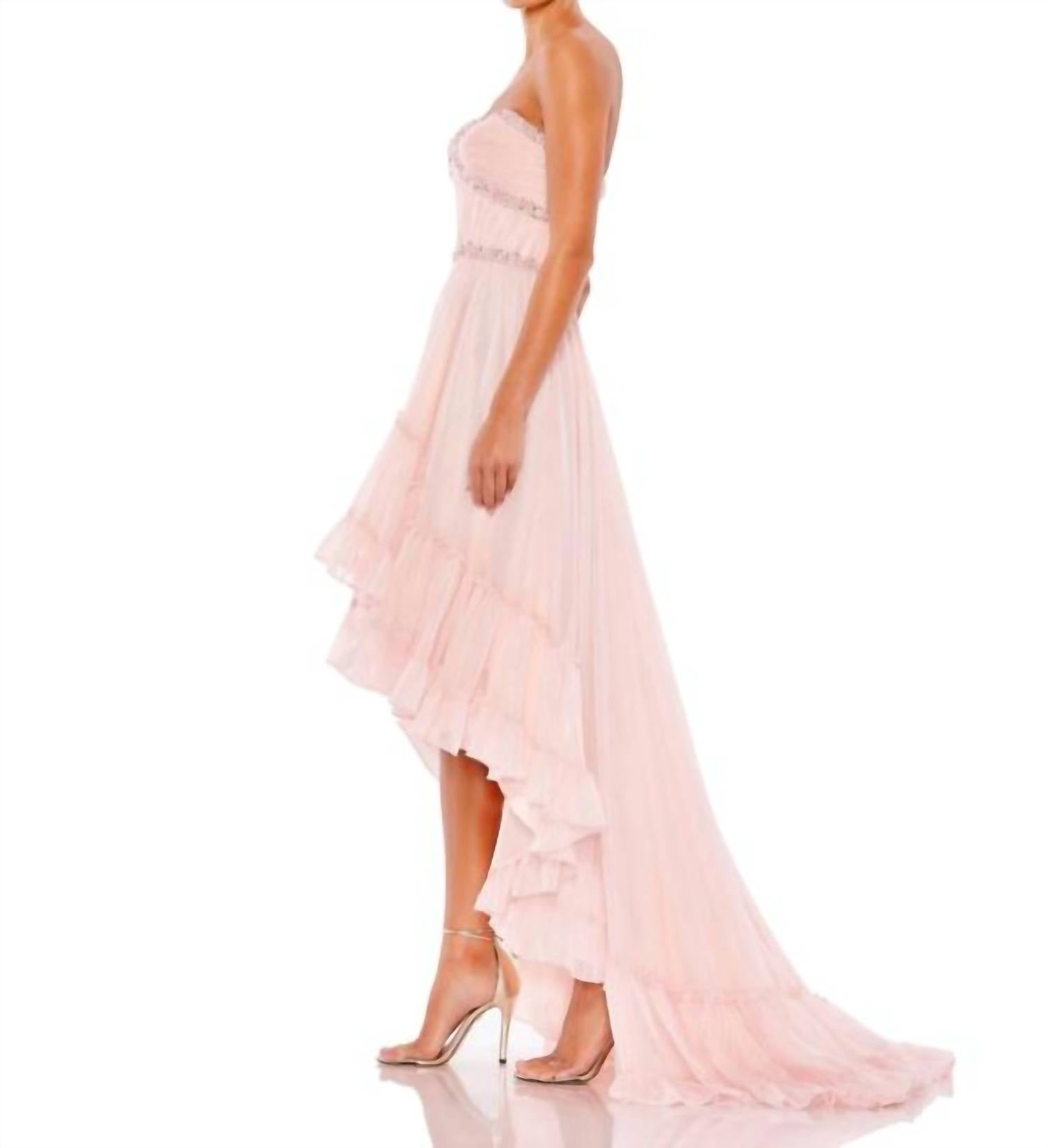 Um vestido longo que é tão fofo quanto confortável. Apresentamos o Vestido Mac Duggal sem alças com decote alto e decote baixo, uma escolha requintada para eventos noturnos em um sofisticado tom rosa-gelo. Este modelo sem alças apresenta um decote coração e uma silhueta fluida em corte A, confeccionada em chiffon etéreo, com detalhes em pedrarias requintadas. O vestido esbanja elegância com sua saia longa e cauda graciosa, finalizada com um zíper seguro para um ajuste impecável. Perfeito para ser o centro das atenções, este vestido, no tamanho 6, mede 40 a 43 cm no peito e 35 cm na cintura.