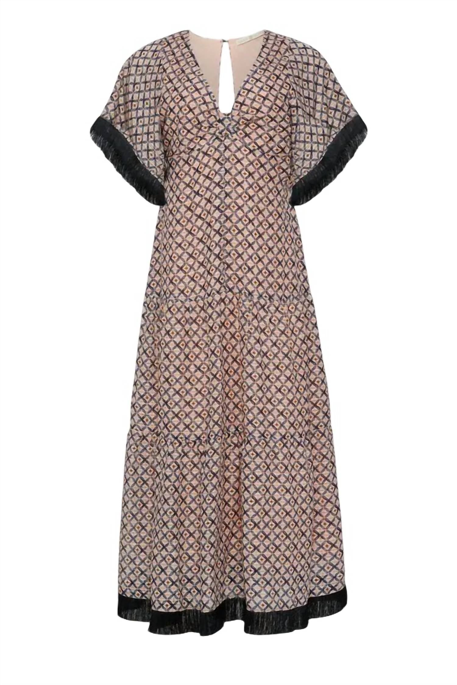 Introducing the Marie Oliver Bernadette Maxi Dress, a stunning piece in a Blush Lattice pattern exuding Boho Chic elegance. This A-line silhouette dress features short sleeves and a feminine V-neckline, crafted from a viscose and linen blend for comfort and style. With button closure details and a keyhole back, this dress is perfect for spring vacation or a New Year's Eve celebration. Care instructions specify dry clean only. 56% Viscose, 44% Linen.