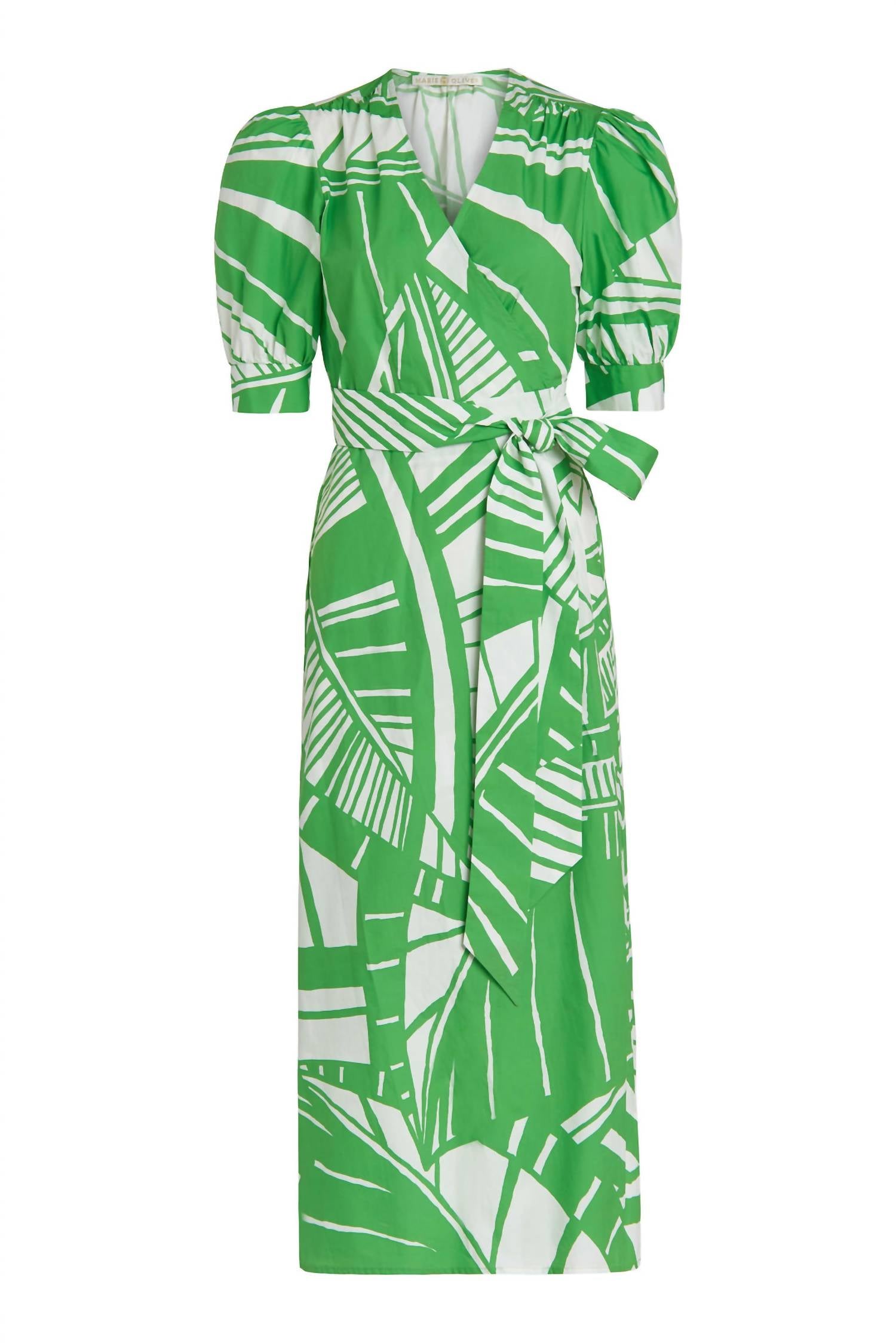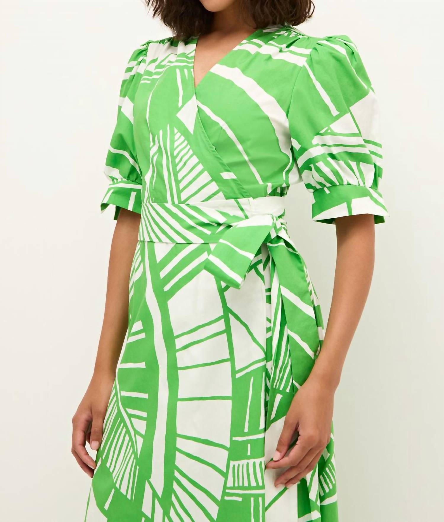 Uma mistura sofisticada de abstratos folhosos em branco impecável e verde-esmeralda. Este vestido longo apresenta mangas curtas bufantes com detalhes nos punhos divididos para um toque de elegância. Confeccionado em 100% algodão, oferece um design envolvente com amarração na cintura para um ajuste personalizado e conforto. Lavar à máquina em ciclo delicado e secar no varal.