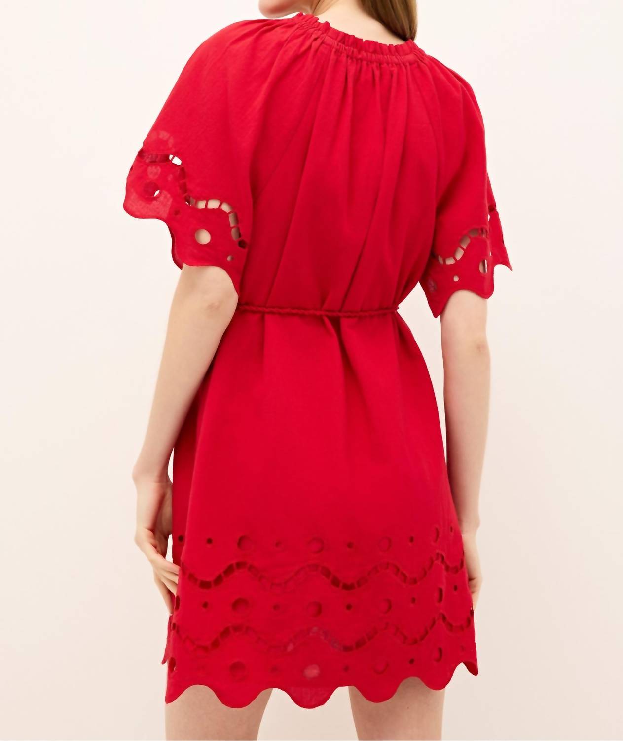 Um vestido curto e arejado para os dias mais quentes. Descubra o Tegan Dress Fresno Eyelet da Marie Oliver, um minivestido vermelho vibrante perfeito para as celebrações da primavera. Esta peça versátil apresenta um corte pull-on com mangas curtas e um decote elástico divertido, permitindo usá-lo por cima ou por fora. Confeccionado em uma mistura leve de 85% algodão e 15% linho, possui bainha e mangas bordadas com ilhós para um toque festivo. Os cuidados são simples: lavar à máquina em um ciclo delicado e secar na horizontal.
