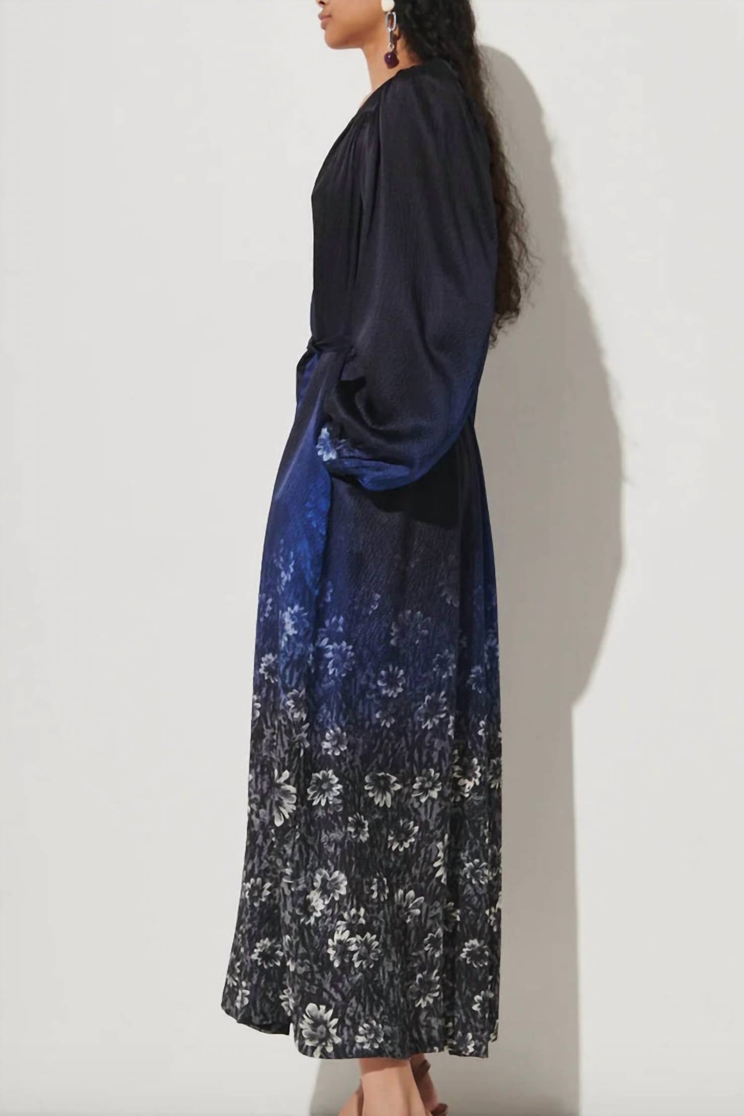 Um vestido elegante e confortável que você vai usar em todas as estações. Vestido estilo bata oversized com decote em V e cinto faixa para amarrar na cintura, em seda martelada com estampa de margaridas ombré. Cinto faixa removível. Bolsos laterais. Tecido: 100% seda. Fabricado em Nova York.