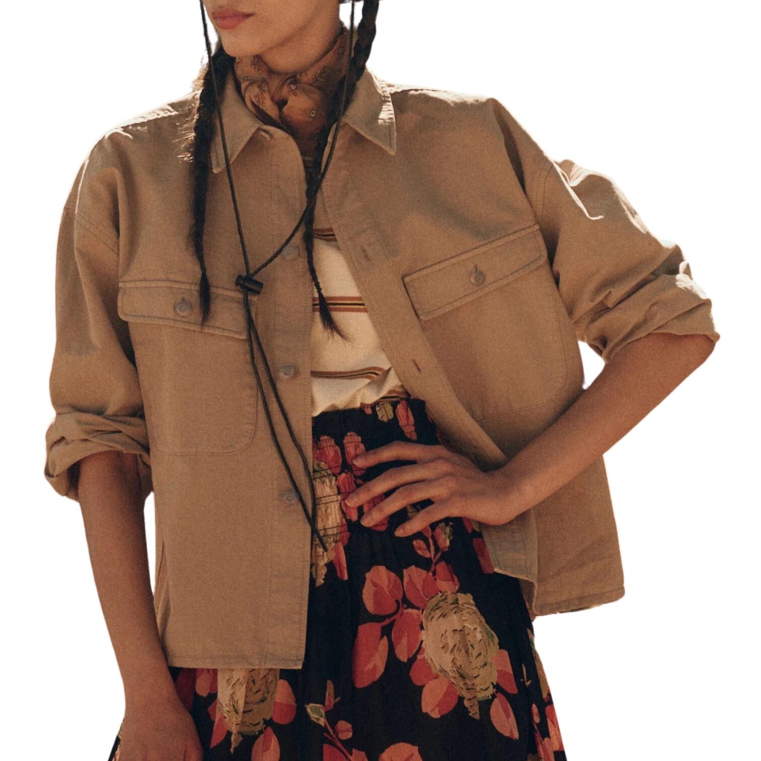 O ÓTIMO. Camisa Arizona Top de Algodão em Desert Fatigue, Jaqueta com Corte Boxy Relaxado, Gola de Camisa, Carcela com Botões Corozo, Bolsos de Aplicação Angulares. Tamanho 1. Medidas: Comprimento 62 cm. Comprimento da Manga 51 cm. Tamanho Fiel. Lavagem a Seco.
