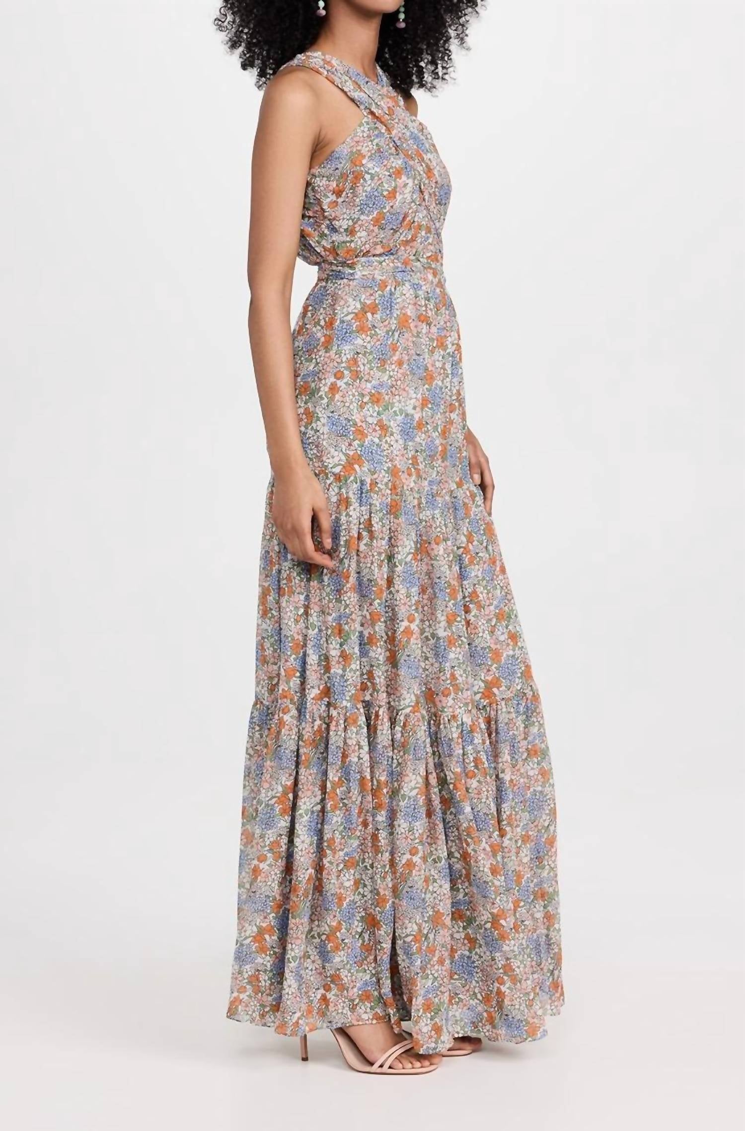 Abrace a elegância com o Vestido Longo Floral Florencia de Seda da Veronica Beard, perfeito para ocasiões sofisticadas. Com um design sem mangas, este vestido é confeccionado em seda 100% luxuosa com um delicado acabamento em chiffon amassado e estampa floral multicolorida em tom off-white. Seu elegante comprimento longo de 140 cm combina perfeitamente com uma saia em camadas e bainha com babados, realçado por um elegante decote halter e costuras laterais com barbatanas. Fechamento: botão com abertura, colchete e zíper lateral oculto. Para maior durabilidade, lave a seco esta peça deslumbrante importada da China.