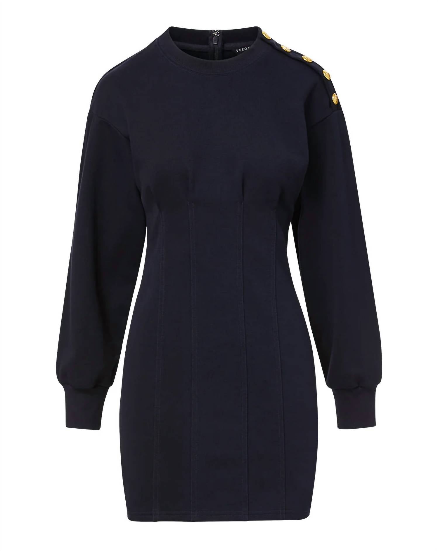 O tipo de vestido fácil e elegante que você vai usar durante toda a estação. 86% algodão, 14% poliéster. Vestido de moletom com costuras sensuais inspiradas em espartilhos e botões dourados característicos em um dos ombros. Fechamento por zíper invisível nas costas. Mangas compridas. Comprimento mini. Comprimento: 86 cm. Somente lavagem a seco. Importado.