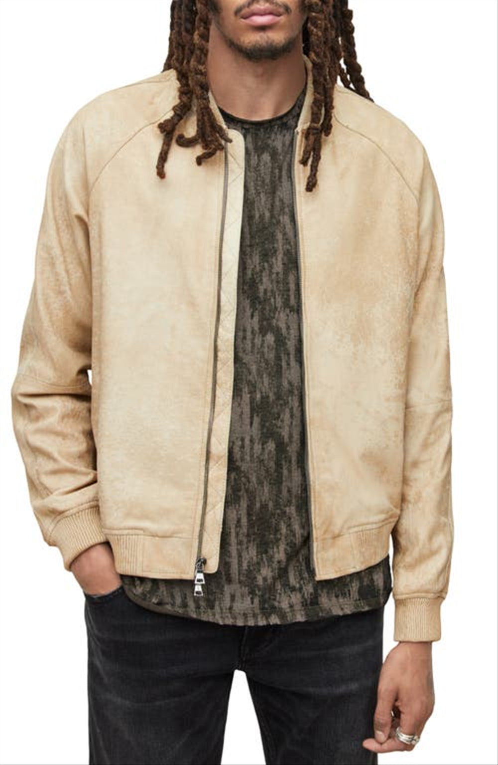 Material de pele de carneiro genuína | Cor crua | Da coleção John Varvatos | Tamanho 50 | Design de jaqueta souvenir | Disponível na Nordstrom | Visual luxuoso | Ajuste confortável | Detalhes elaborados | Estilo atemporal