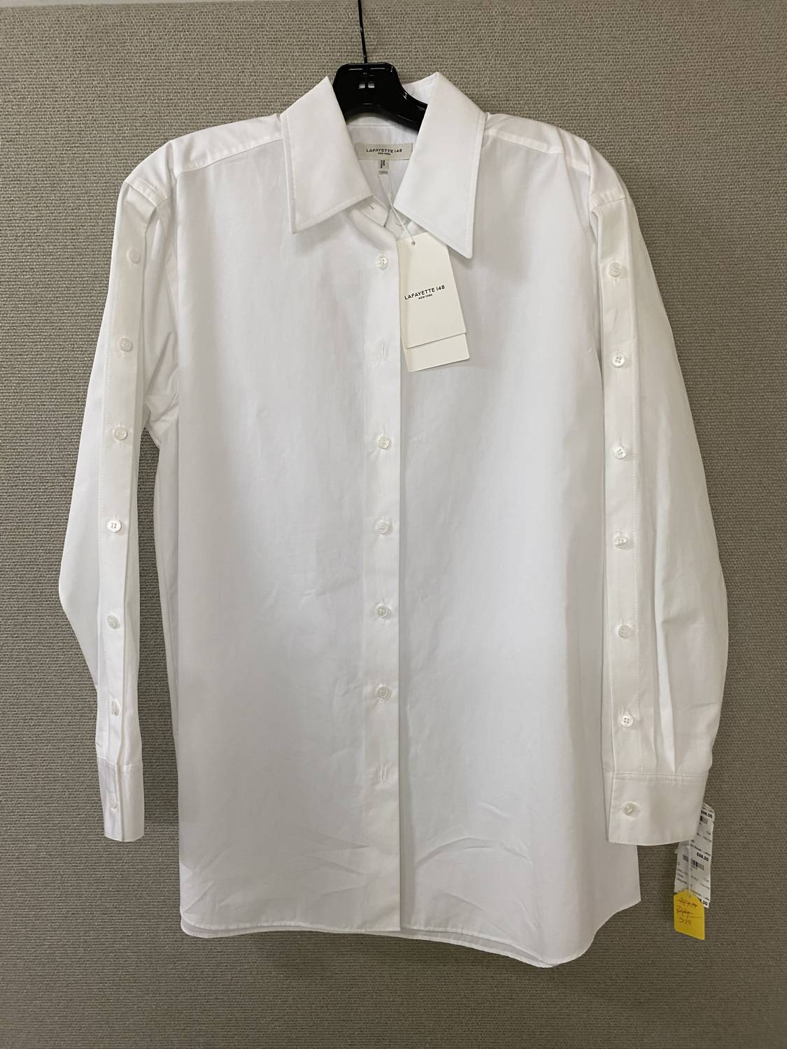 The Women's Button Sleeve Oversized Shirt by Lafayette 148 is a chic addition to any wardrobe, crafted in a timeless white solid pattern. This long sleeve shirt provides a polished look with a classic collar and convenient button closure. Perfect for versatile styling, it can elevate both casual and professional ensembles. Designed without the limitations of activewear, this piece is an excellent choice for sophisticated layering.