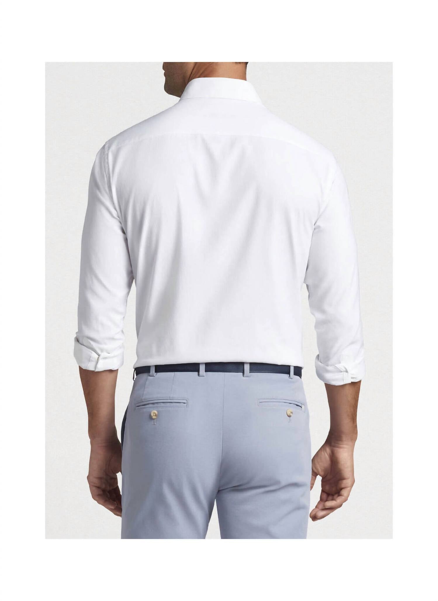 Descubra a Camisa Esportiva Oxford Performance PETER MILLAR Colins, confeccionada para o máximo conforto e estilo. Esta camisa masculina de manga comprida é confeccionada em 100% poliéster, oferecendo um caimento clássico com fecho de botão. Desenhada com gola abotoada, carcela francesa e punhos com dois botões, ela possui elasticidade bidirecional e propriedades de absorção de umidade, proporcionando proteção solar FPS 50+. Cuide desta camisa lavando-a na máquina e secando-a na horizontal.