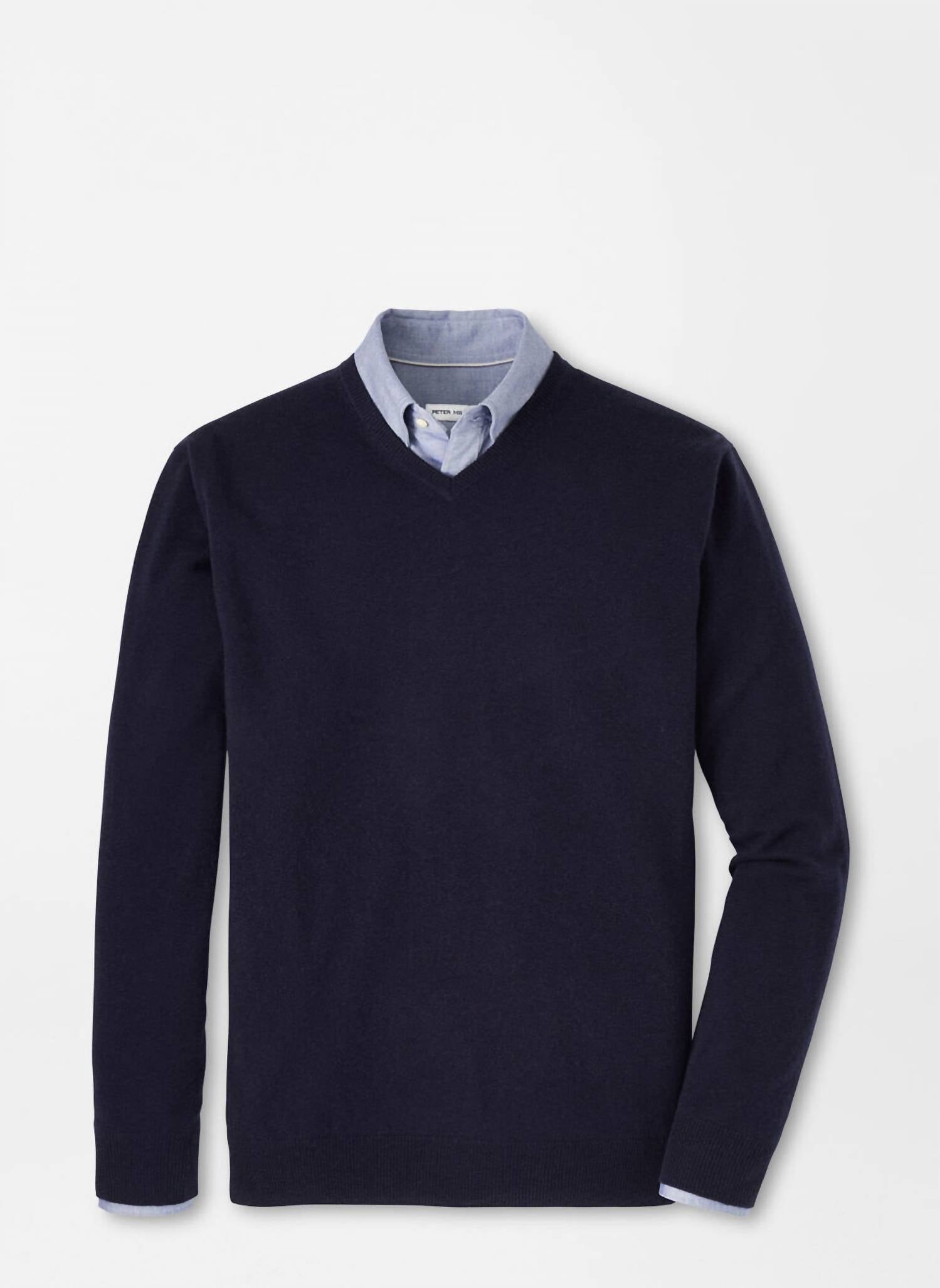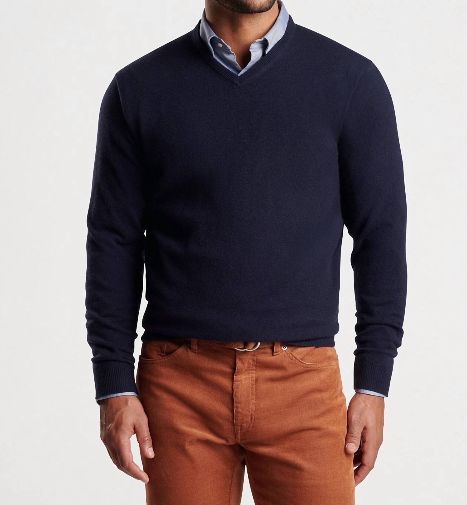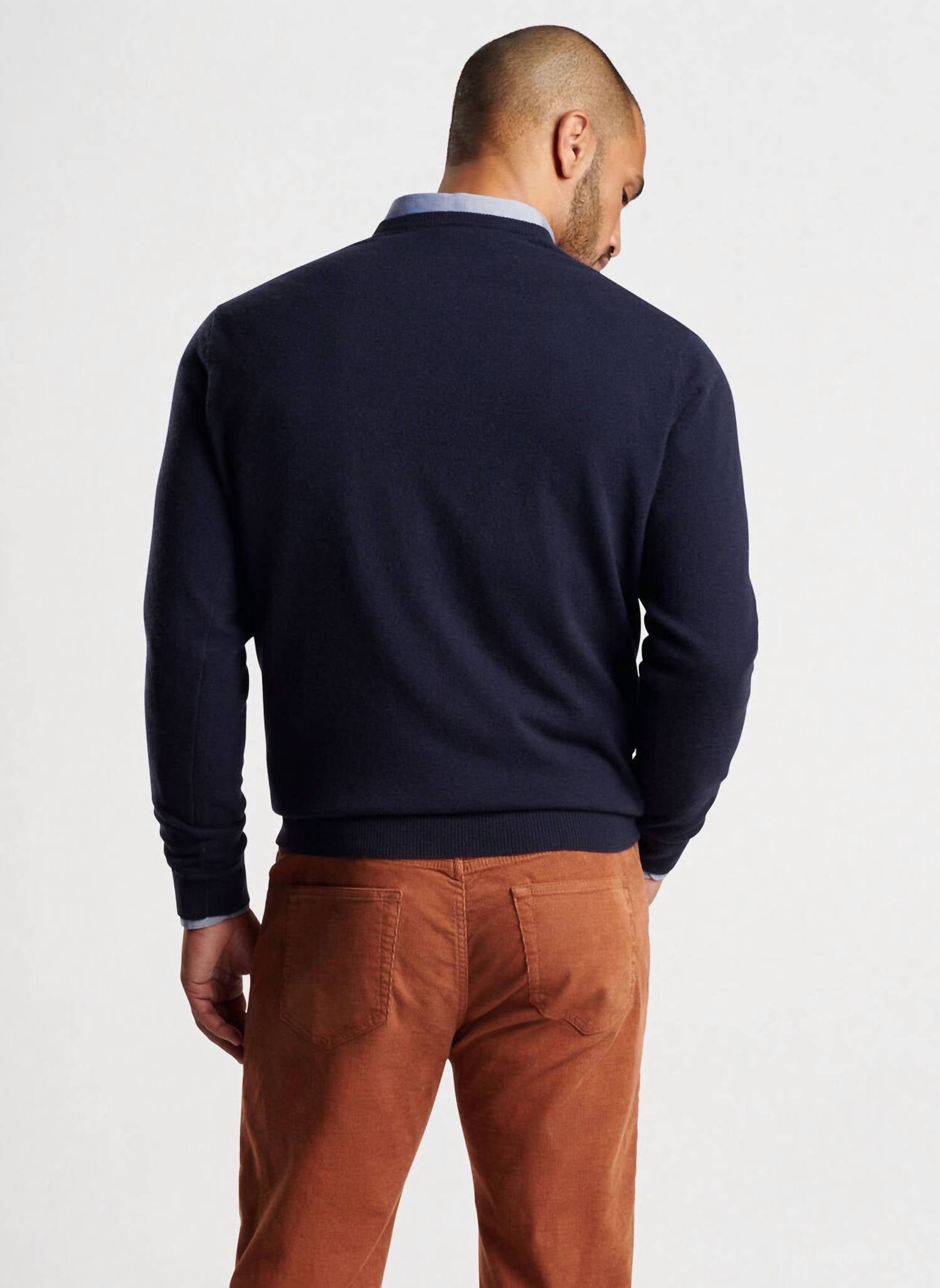 Eleve seu guarda-roupa com o suéter Crown Heritage Cashmere com gola V da PETER MILLAR, confeccionado em um tom marinho intenso. Confeccionado em 100% cashmere com uma malha luxuosa de calibre 12, este design sólido e clássico garante aquecimento e conforto. Com fecho pull-on e mangas compridas, é uma escolha refinada para qualquer ocasião. Cuide desta peça importada lavando-a à mão em água fria e secando na horizontal, ou opte por uma lavagem a seco profissional para obter melhores resultados.