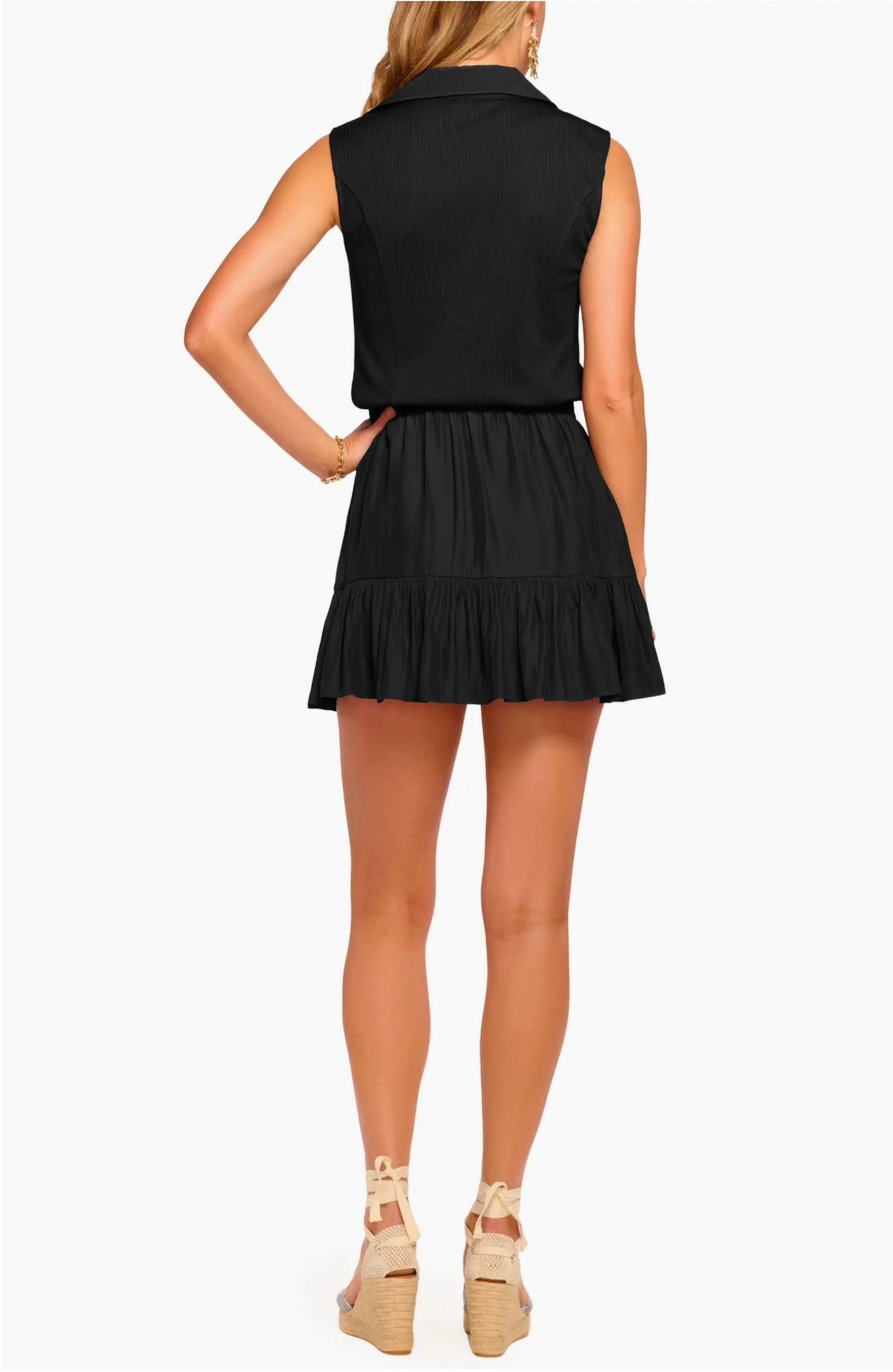 A short and breezy dress for those warmer days. Meet the Odette Ribbed Combo Mini Dress by Ramy Brook, a stylish choice for any summer occasion in timeless black. This sleeveless dress is crafted from 100% polyester with a contrasting ribbed bodice, featuring a button closure and elastic waistband for a flattering fit. Designed for a mini length of 33.5", it has a ruffled hemline and a lined interior for added comfort. Care for it with ease—simply machine wash and tumble dry.