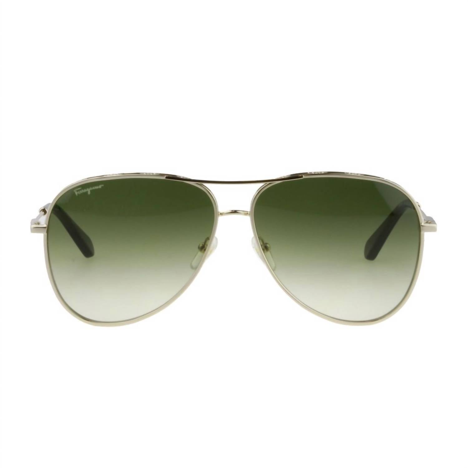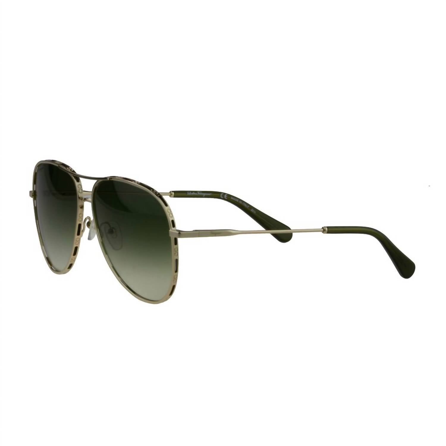 Apresentamos os Óculos de Sol Femininos SF268S da Salvatore Ferragamo, um acessório chique que combina estilo e funcionalidade sem esforço. Estes óculos de sol estilo aviador são confeccionados em materiais metálicos e apresentam uma construção dourada ousada com lentes em dois tons de verde degradê. As dimensões das lentes incluem uma largura de 62 mm, complementada por uma largura de ponte de 13 mm e um tamanho de haste de 140 mm, garantindo um ajuste confortável. Eleve qualquer look com estes óculos de sol premium e modernos.