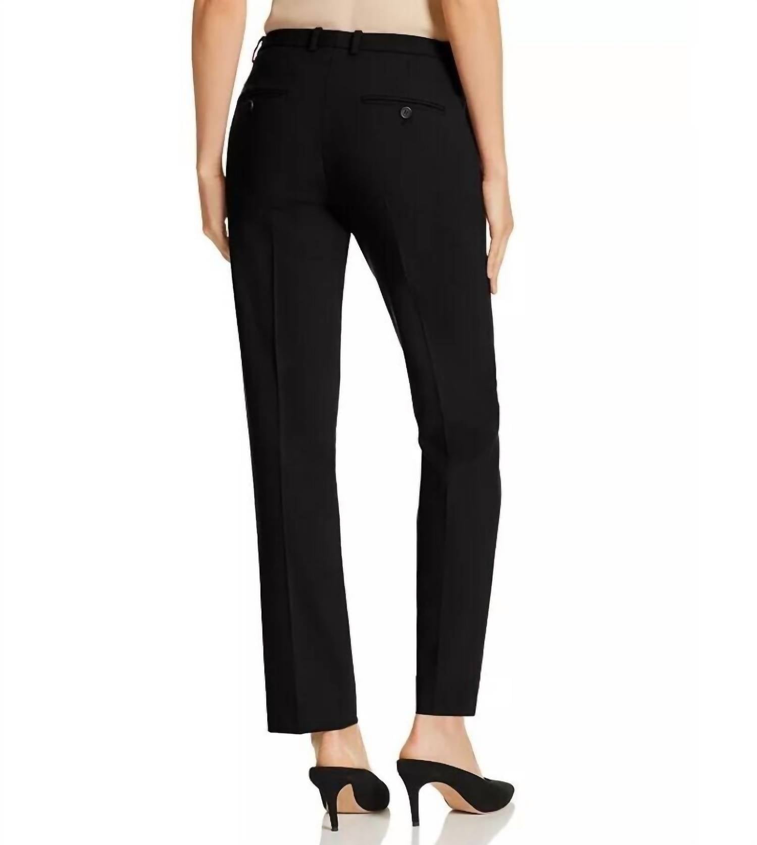 Cintura com faixa, passantes para cinto. Braguilha com zíper, fecho de velcro e botão. Frente lisa, costas com pinças. Bolsos laterais com fenda, bolsos traseiros com fenda e botão. Vinco central na perna, corte reto. Comprimento até o tornozelo, construção em lã elástica. Materiais: 96% lã virgem, 4% elastano; Forro dos bolsos: poliéster/poliuretano. Lavagem a seco. Tamanho real. A modelo tem 1,78 m e veste tamanho 38.