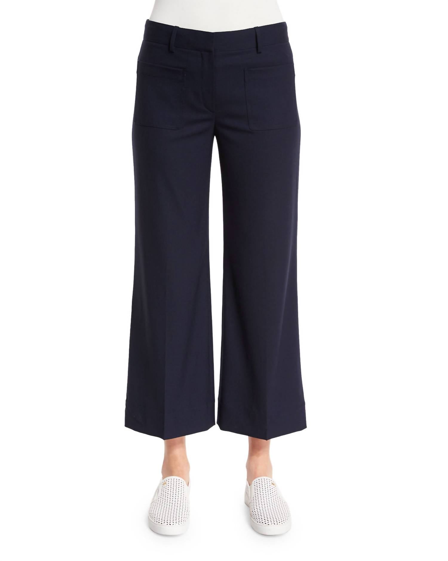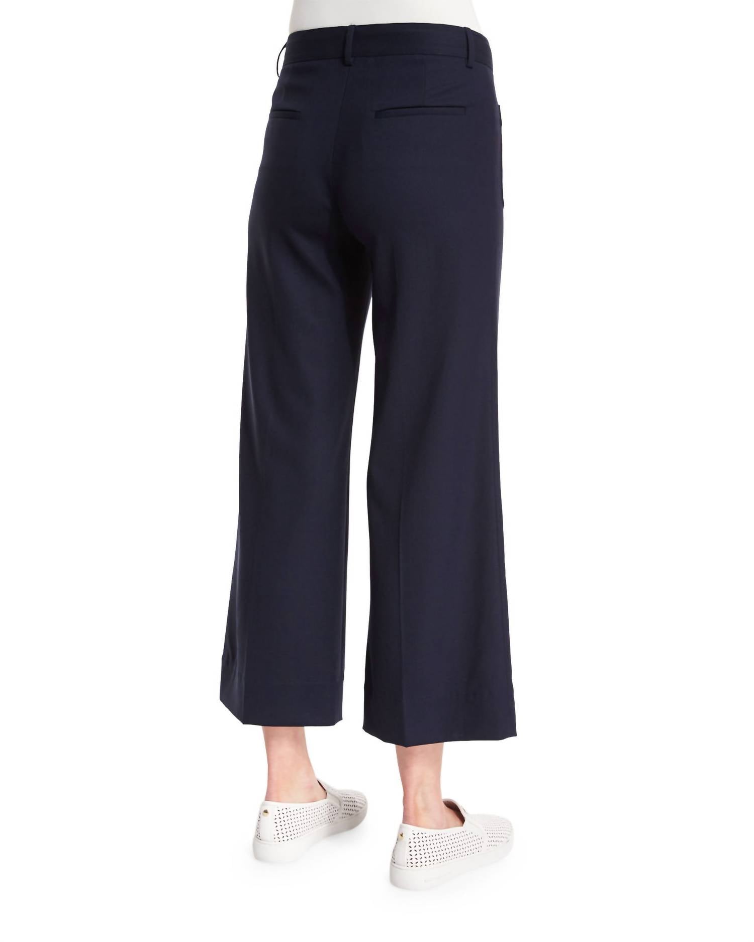Bolsos frontais de aplicação. Bolsos traseiros embutidos. Pernas largas que vão dos joelhos. Corte acima do tornozelo. Fecho de aba e braguilha com zíper. Passantes para cinto. Material: 100% lã virgem. Forro: 100% poliéster. Lavagem a seco. Medidas aproximadas: 28 cm de altura; 68 cm de costura interna; 94 cm de costura externa; 29 cm de abertura da perna.