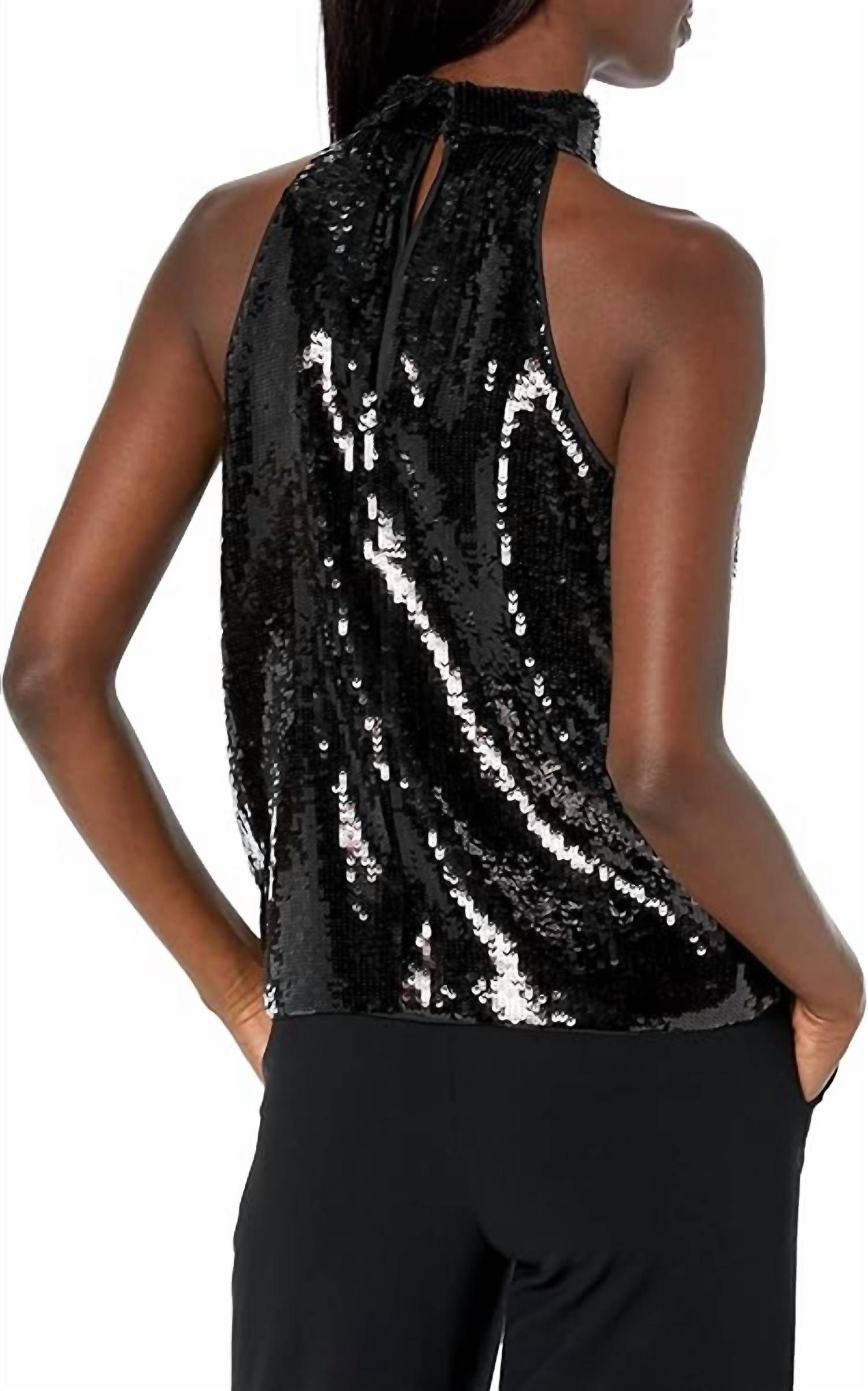 Combine isso com seus jeans e chinelos favoritos para sua próxima noite entre amigas. Esta blusa de gola alta com alças finas apresenta um decote halter elegante, textura de lantejoulas e fecho de botão na nuca, feita de 100% poliéster reciclado para um ajuste fino e moderno.