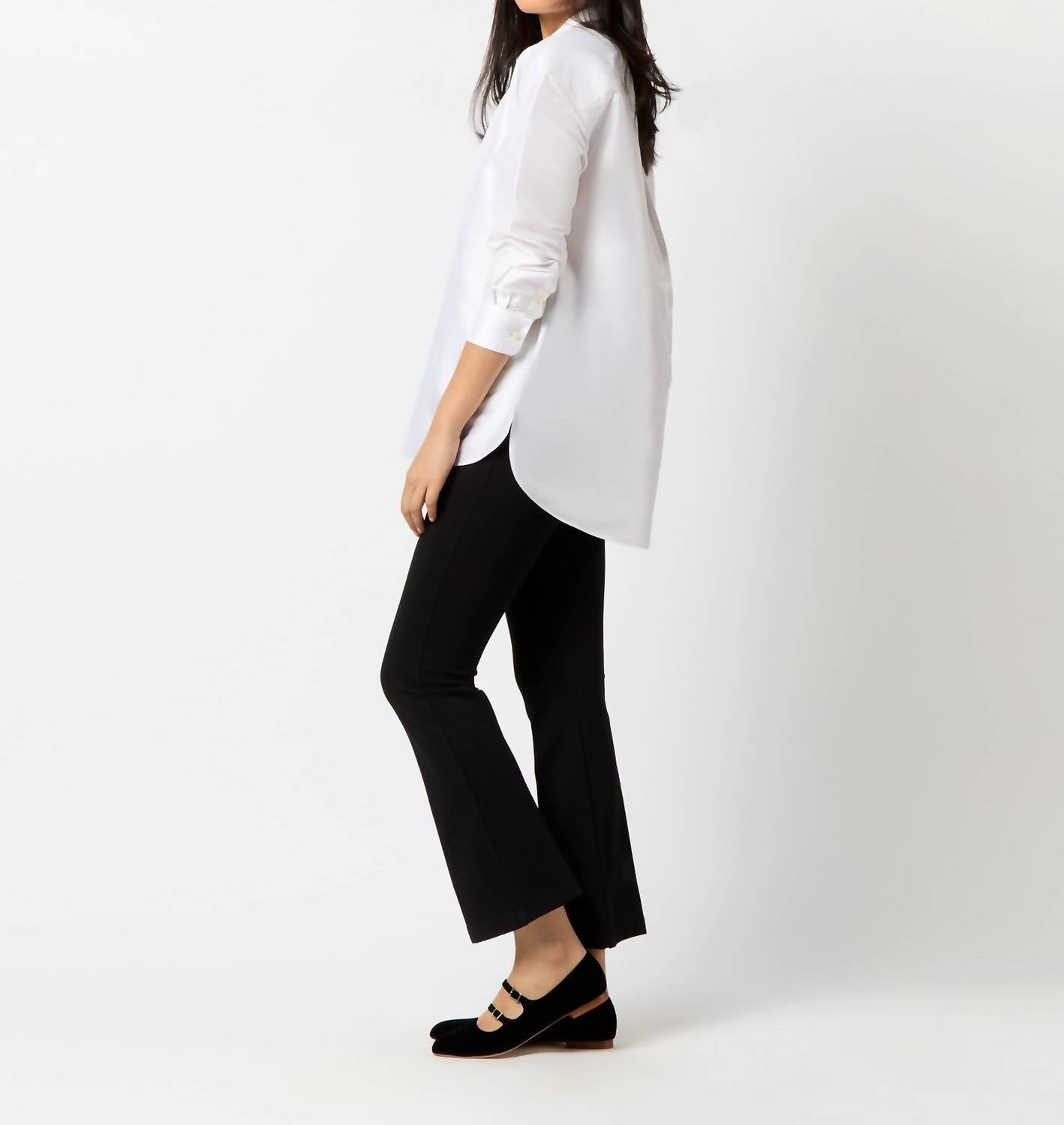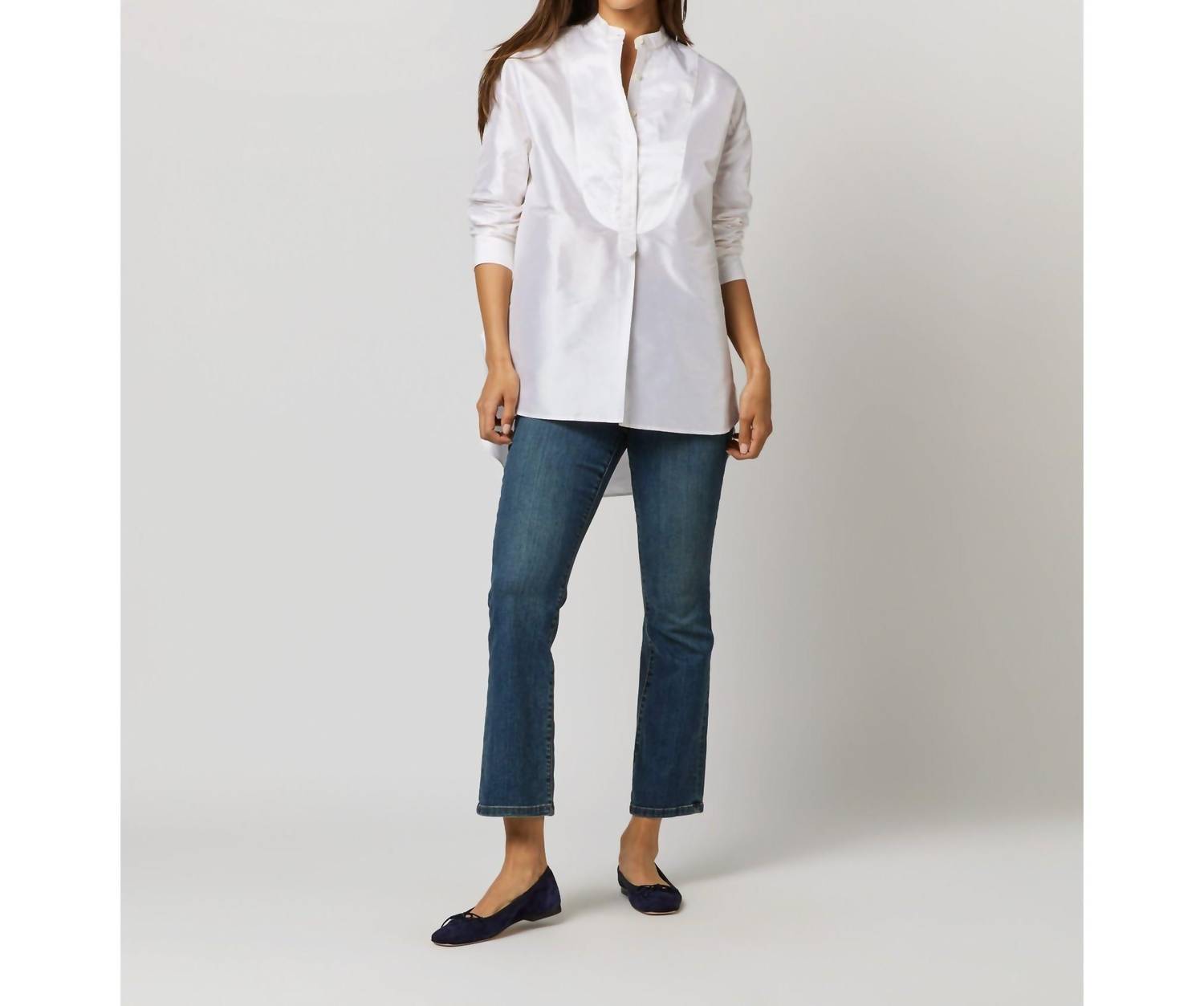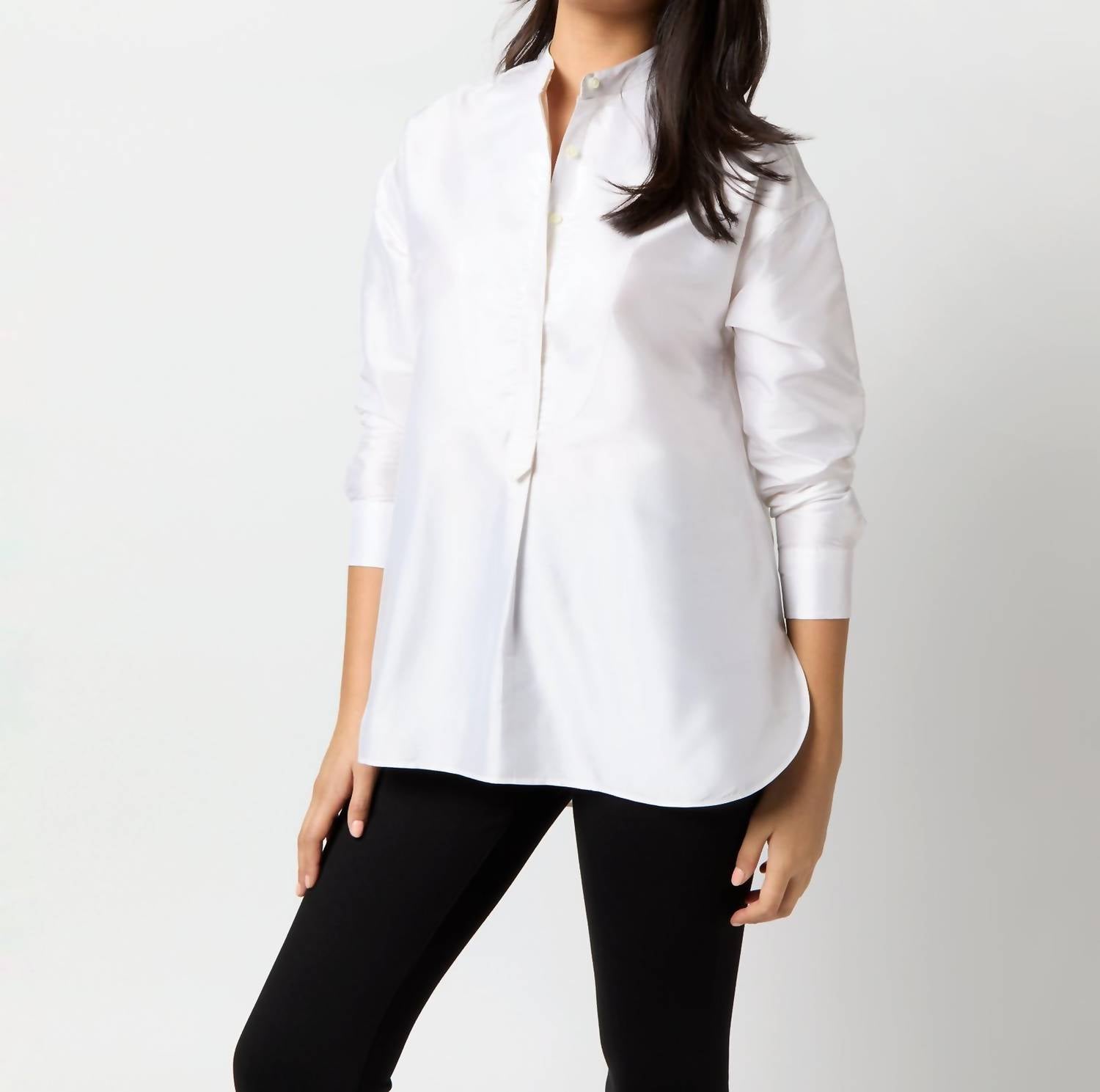 Aproveite a versatilidade desta blusa estilo túnica, habilmente confeccionada para ser usada em camadas sem costura ou sozinha. Seu design detalhado e caimento confortável a tornam um complemento perfeito para qualquer guarda-roupa. Apresentamos a Túnica Christiane com Babado Frontal da Ann Mashburn, uma elegante adição ao seu guarda-roupa, confeccionada em luxuoso shantung 100% seda marfim da Índia. Desenhada com mangas longas, esta peça apresenta uma gola mandarim clean e uma bainha chique com barra alta e baixa, tornando-a ideal para usar sobre calças ou por dentro de jeans. Confeccionada com atenção meticulosa aos detalhes, possui botões Trocas de 3,5 mm e uma abertura frontal forrada, tudo de Honduras. Fechamento: Fechamento por botão. Cuidados: Somente lavagem a seco.