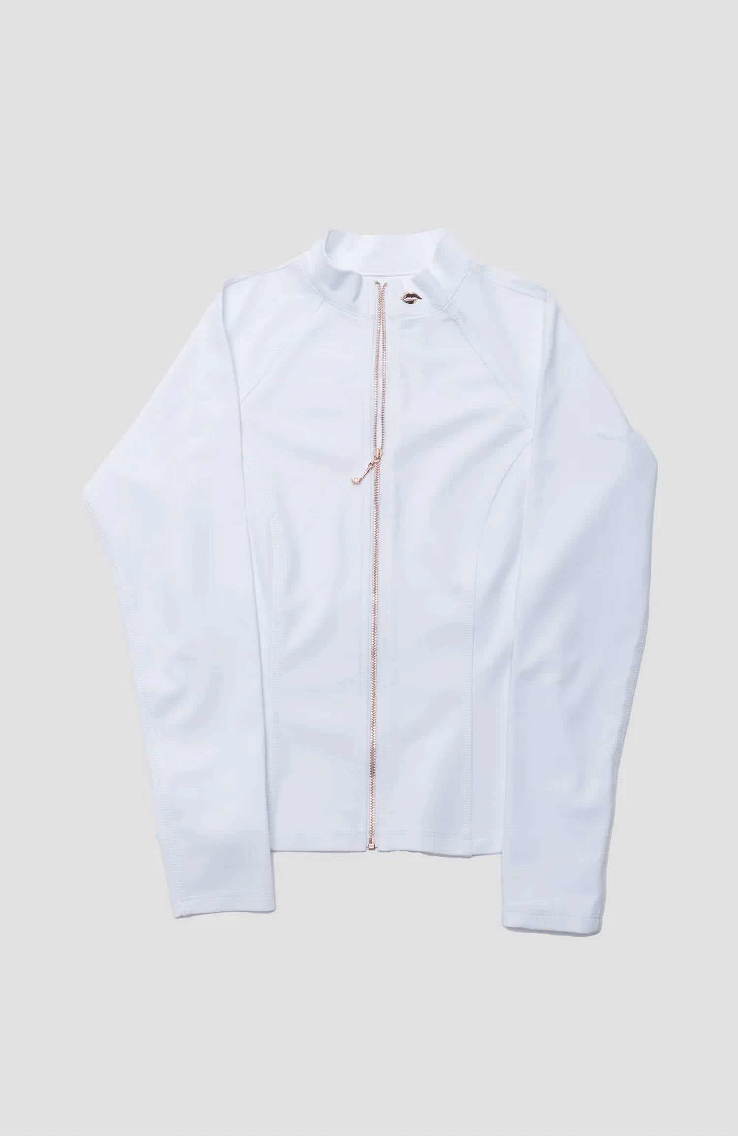Bonita, casual e confortável. Esta jaqueta é um item essencial. Novo item esportivo essencial para uso dentro e fora do campo. Com mangas compridas e gola justa, apresenta um design que valoriza a silhueta. Confeccionado em tecido italiano de alta qualidade, composto por 45% poliéster, 40% algodão e 15% elastano, proporcionando elasticidade de 360 ​​graus. Fabricado nos EUA. Apresenta um elegante fecho de zíper em ouro rosé com um puxador de zíper exclusivo em formato de taco de golfe e um alfinete removível para um toque elegante. Cuide bem da sua jaqueta lavando-a na máquina com água morna e depois colocando-a para secar na horizontal.