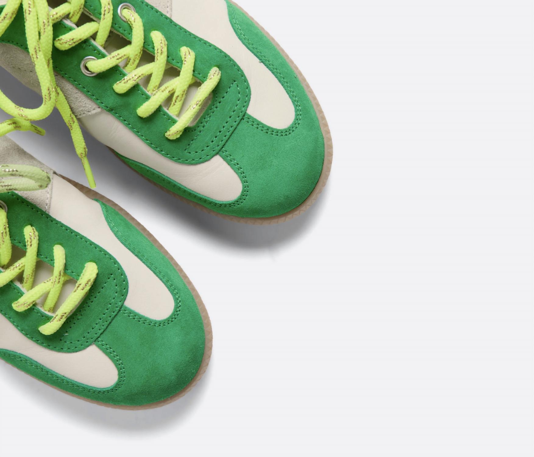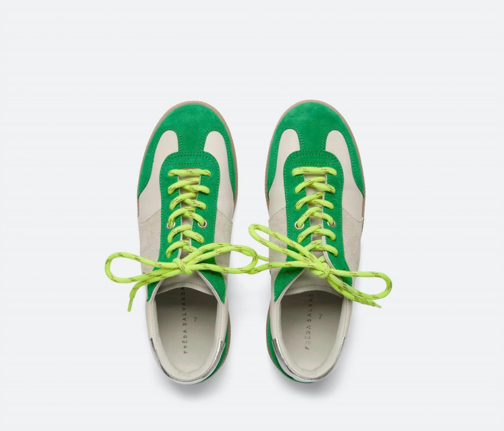 Bonitos, funcionais e confortáveis. Estes tênis atendem a todos os requisitos. Apresentamos o Tênis Jackie Court da FREDA SALVADOR em um elegante conjunto de camurça verde, perfeito para suas viagens de verão. Confeccionado em couro 100% italiano, este tênis possui palmilha acolchoada em couro e antepé com forro em mesh respirável, garantindo conforto e durabilidade. O salto plataforma proporciona uma elevação de 2,5 cm, complementado por uma plataforma de 1,2 cm, e o solado de borracha garante tração confiável. Com bico arredondado, ilhós com cadarço e dois pares de cadarços, todos confeccionados na Itália, este tênis é tão versátil quanto estiloso, com ajuste perfeito para mulheres.