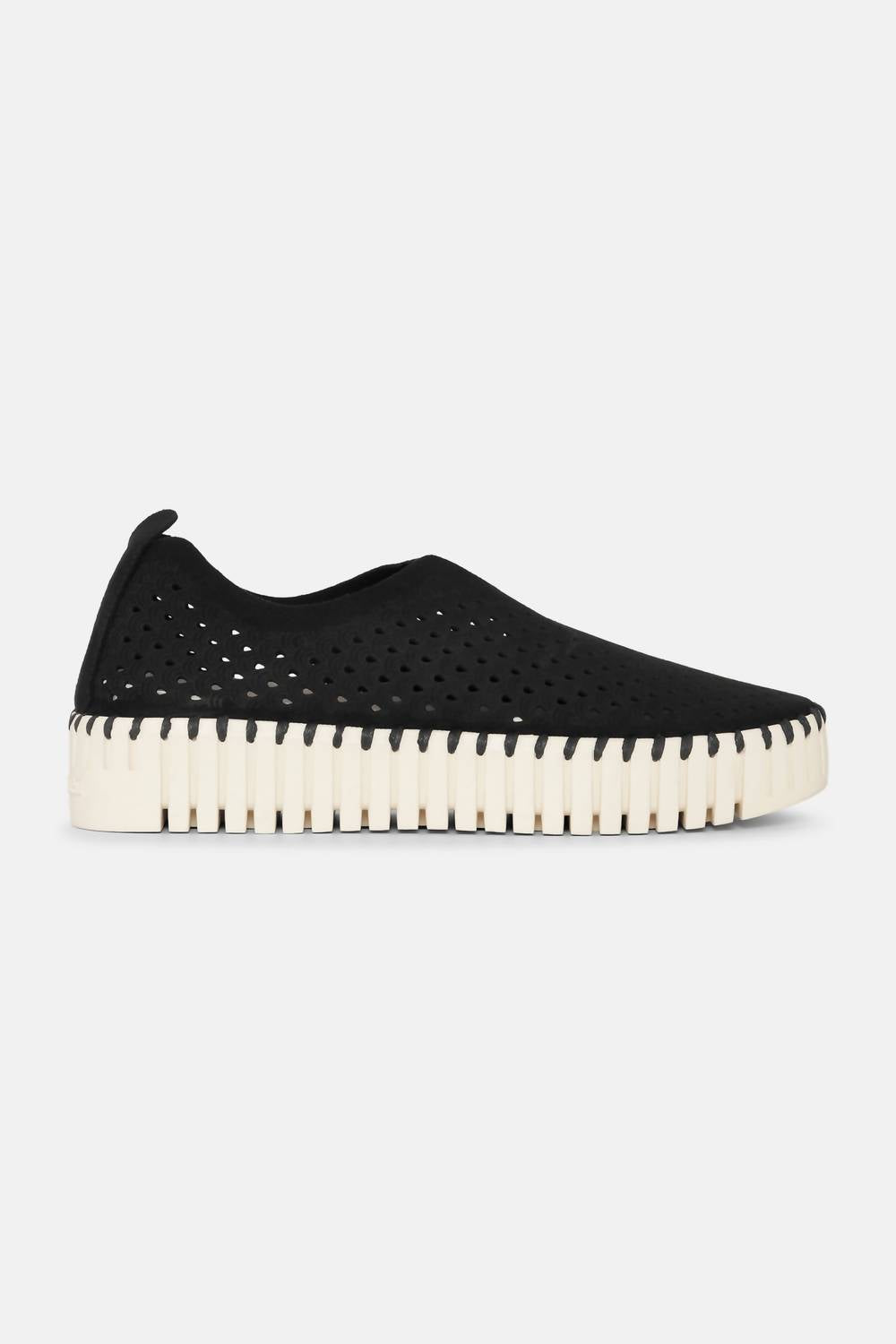 Quando moda e funcionalidade se unem perfeitamente. Este slip-on plataforma apresenta um cabedal feito de microfibra reciclada com um padrão decorativo cortado a laser. Ele é costurado ao solado flexível com linha reciclada, eliminando a necessidade de cola. No interior, uma palmilha macia forrada com couro de porco proporciona conforto. O solado plataforma combina borracha natural e reciclada para maior durabilidade, com salto de 4 cm e biqueira de 3 cm.