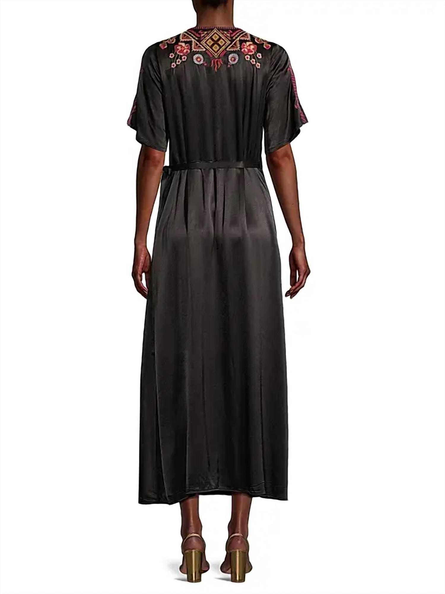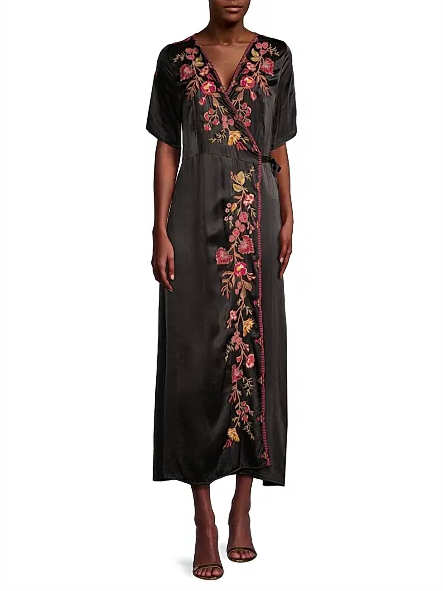 Eleve seu guarda-roupa com o Vestido Envelope de Seda Lilith da Johnny Was, perfeito para capturar a essência do Boho Chic. Este vestido longo apresenta decote em V e mangas curtas, lindamente adornado com uma estampa floral em preto clássico. Confeccionado em 57% rayon e 43% viscose, com fecho de amarrar. Para manter sua beleza, lave somente a seco.