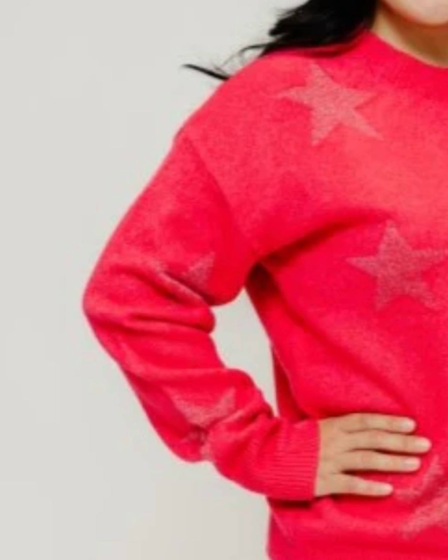 O suéter Taylor Star da SKIES ARE BLUE é um item essencial de inverno com um toque de brilho, perfeito para viagens ou comemorações do Dia dos Namorados. Este suéter de manga comprida apresenta uma estampa gráfica em grande escala com estrelas de Lurex rosa brilhantes, tudo em um tom magenta vibrante. Confeccionado em uma mistura de nylon macio composta por 53% acrílico, 19% nylon, 16% poliéster, 6% viscose, 4% lã e 2% elastano, oferece um estilo confortável e maximalista. O suéter é pull-on, com gola redonda clássica e requer lavagem à mão para cuidados. A modelo tem 1,52 m e veste tamanho M.