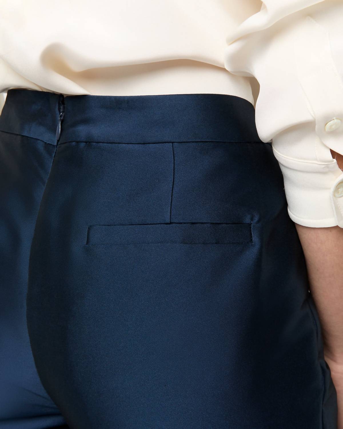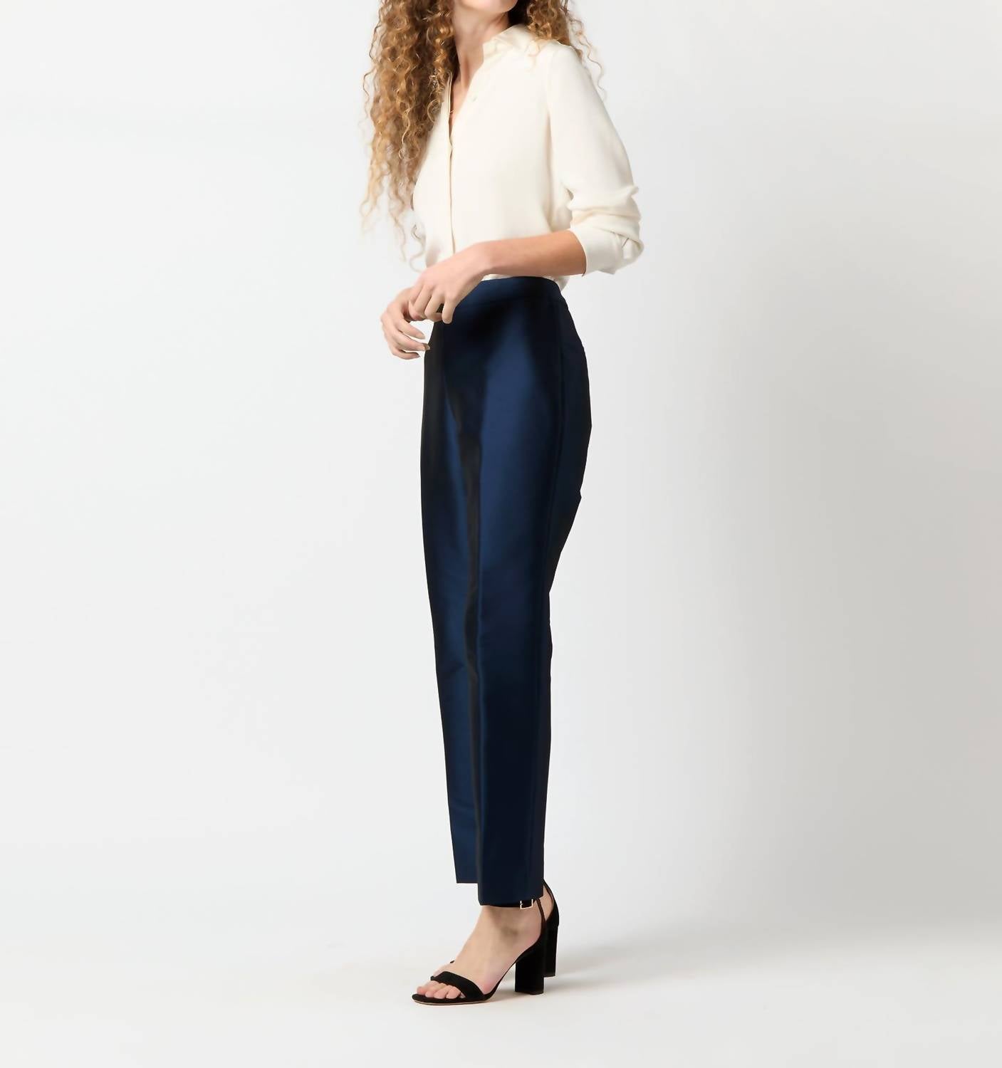 Incremente seu guarda-roupa com este modelo cropped moderno, criado para aliar estilo e praticidade. O caimento confortável permite um uso fácil durante todo o dia. O comprimento perfeito para combinar com seus mules favoritos. Apresentamos a Calça Julia Ann Mashburn, uma escolha elegante para o seu guarda-roupa em um elegante e sólido Mikado Azul-Marinho. Esta calça feminina apresenta um corte estilo cigarro com uma costura interna curta de 71 cm para um visual moderno, confeccionada em mikado italiano composto por 86% poliéster, 13% náilon e 1% elastano, que mantém sua forma perfeitamente. Projetada com um fecho de zíper invisível nas costas, esta calça é confeccionada com um vinco prensado ao longo do centro para uma aparência elegante, semelhante a uma calça. Fabricada na China, inclui bolsos traseiros embutidos com alinhavo e é recomendada apenas para lavagem a seco. Ideal para tendências minimalistas e adequada para eventos noturnos, é perfeita para o outono.