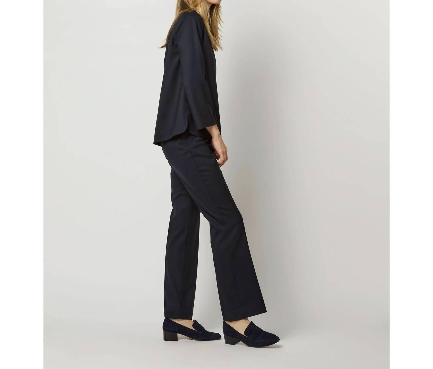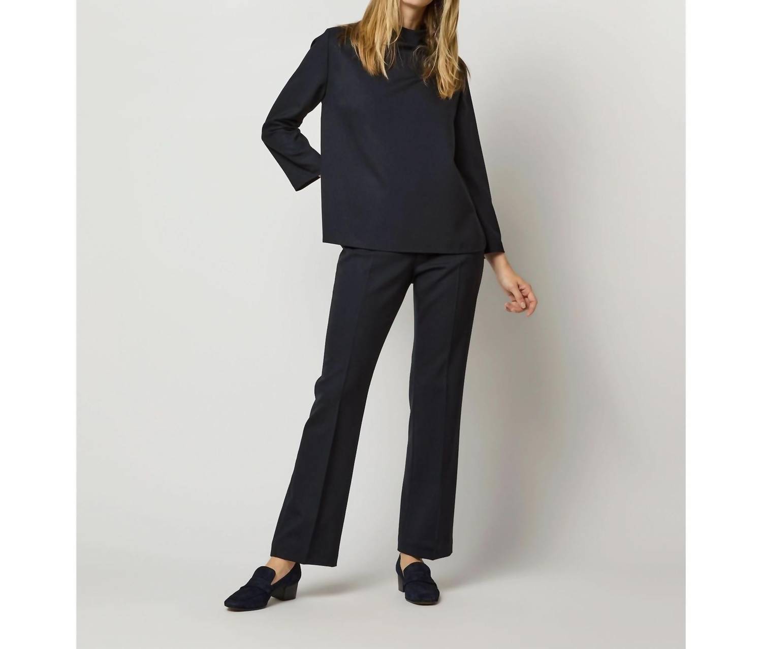 Combine isso com seus jeans e chinelos favoritos para sua próxima noite entre amigas. Descubra o Reese Top da Ann Mashburn, confeccionado em luxuosa lã tropical 100% italiana em um tom escuro. Com elegantes mangas três quartos e um decote falso elegante, esta peça foi projetada para um ajuste confortável e um estilo sofisticado. Com um prático fecho de zíper invisível nas costas, é finalizado com uma bainha arredondada com fendas laterais, perfeita para um visual despojado. Fabricado na China, este elegante top requer lavagem a seco para manutenção e mede 60 cm de comprimento, ideal para uso profissional no outono ou em viagens.