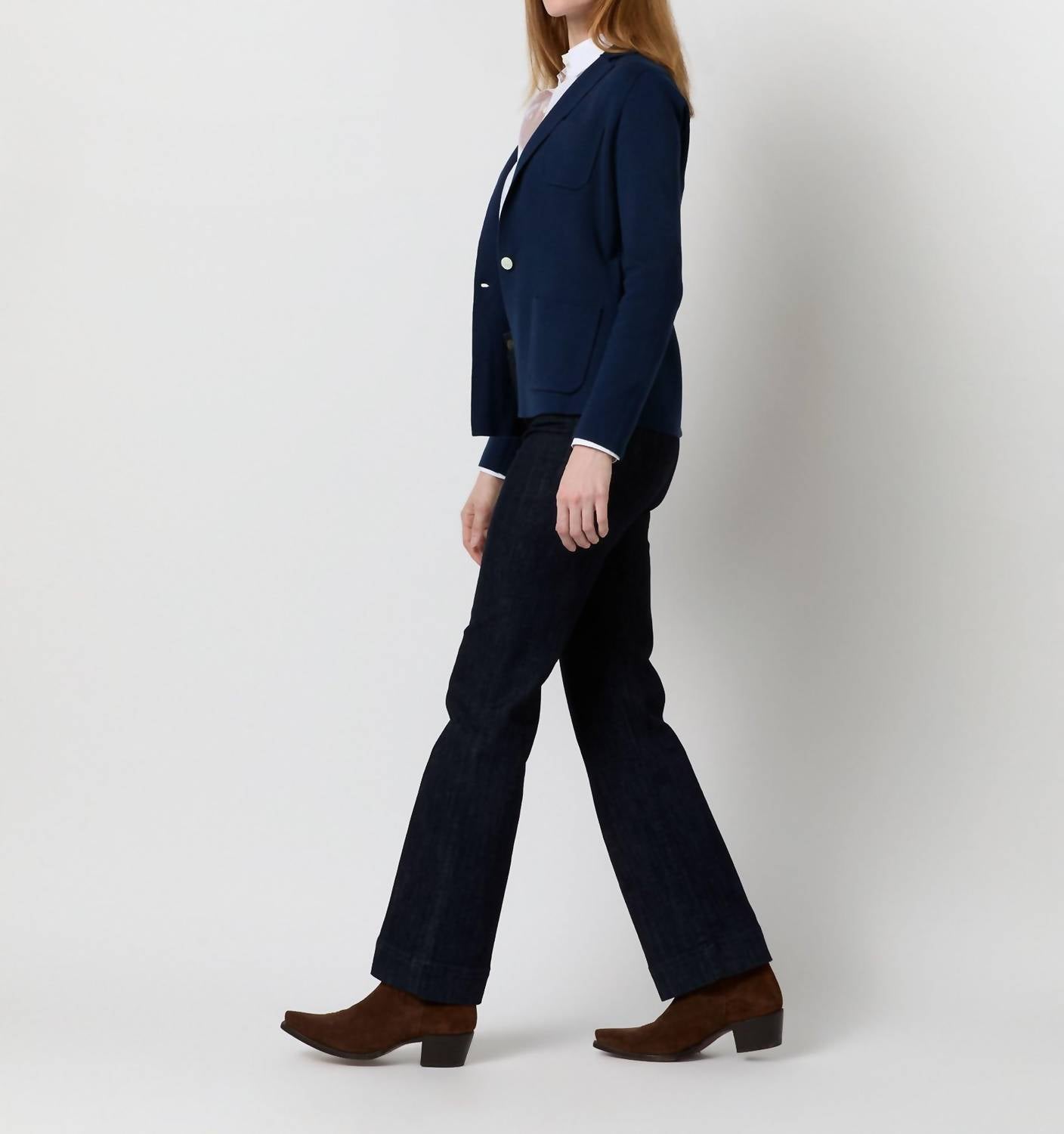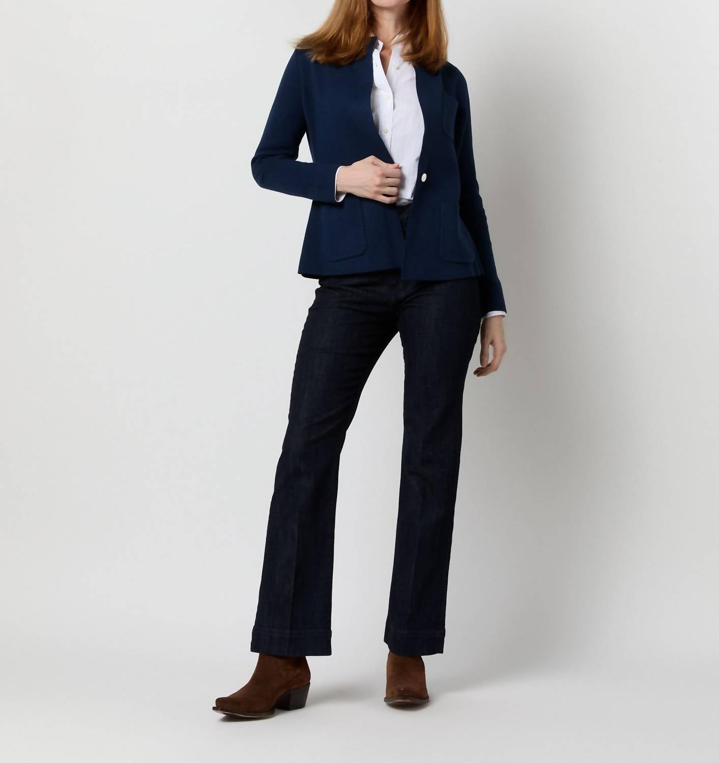 Uma jaqueta tão versátil que você pode usá-la com qualquer coisa. Apresentamos a Jaqueta Schoolboy da Ann Mashburn, uma mistura estilosa de conforto e elegância, perfeita para viagens. Esta jaqueta casual de manga comprida, confeccionada em uma luxuosa mistura de algodão texturizado, apresenta botões de madrepérola e bolsos aconchegantes no peito e no quadril. Originária da China, é uma escolha elegante para o trabalho de outono, em uma elegante mistura de algodão e seda azul-marinho. Para manter sua qualidade, lave-a à mão com água fria e deixe-a secar na horizontal.