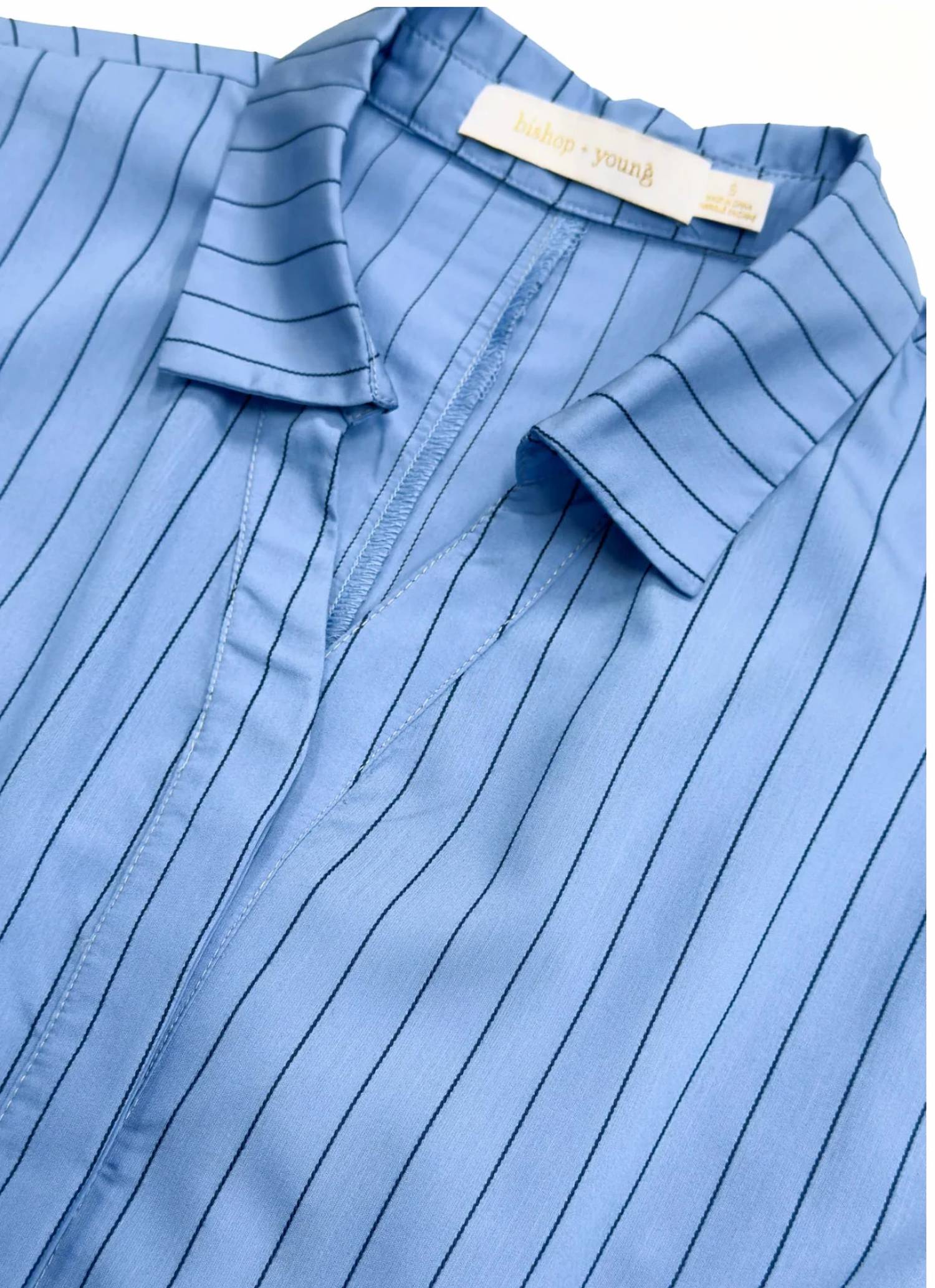 O Vestido Margaux da Bishop + Young é o epítome do estilo elegante de verão com sua estampa de listras azuis e corte moderno. Com gola V e mangas curtas, este vestido é confeccionado em uma confortável mistura de 50% algodão, 38% poliéster e 12% náilon. Seu comprimento midi é complementado por um fecho frontal com botões e um cós com amarração, valorizando a silhueta ampulheta. Esta peça combina conforto e sofisticação para a mulher moderna.