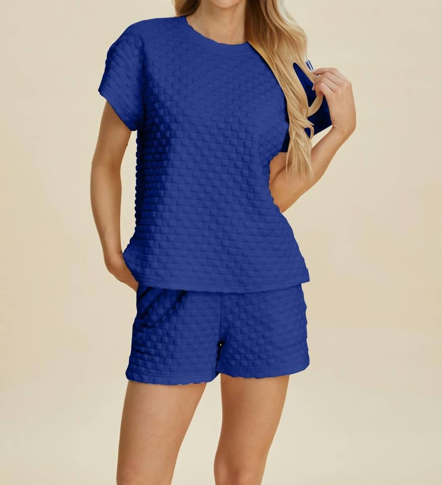 Este conjunto de camiseta e shorts com textura elegante é feito de 95% poliéster e 5% elastano para um ajuste confortável e levemente elástico. A camiseta tem mangas curtas e gola redonda, enquanto o shorts tem cordão, ambos com fecho de puxar e instruções fáceis de cuidar.