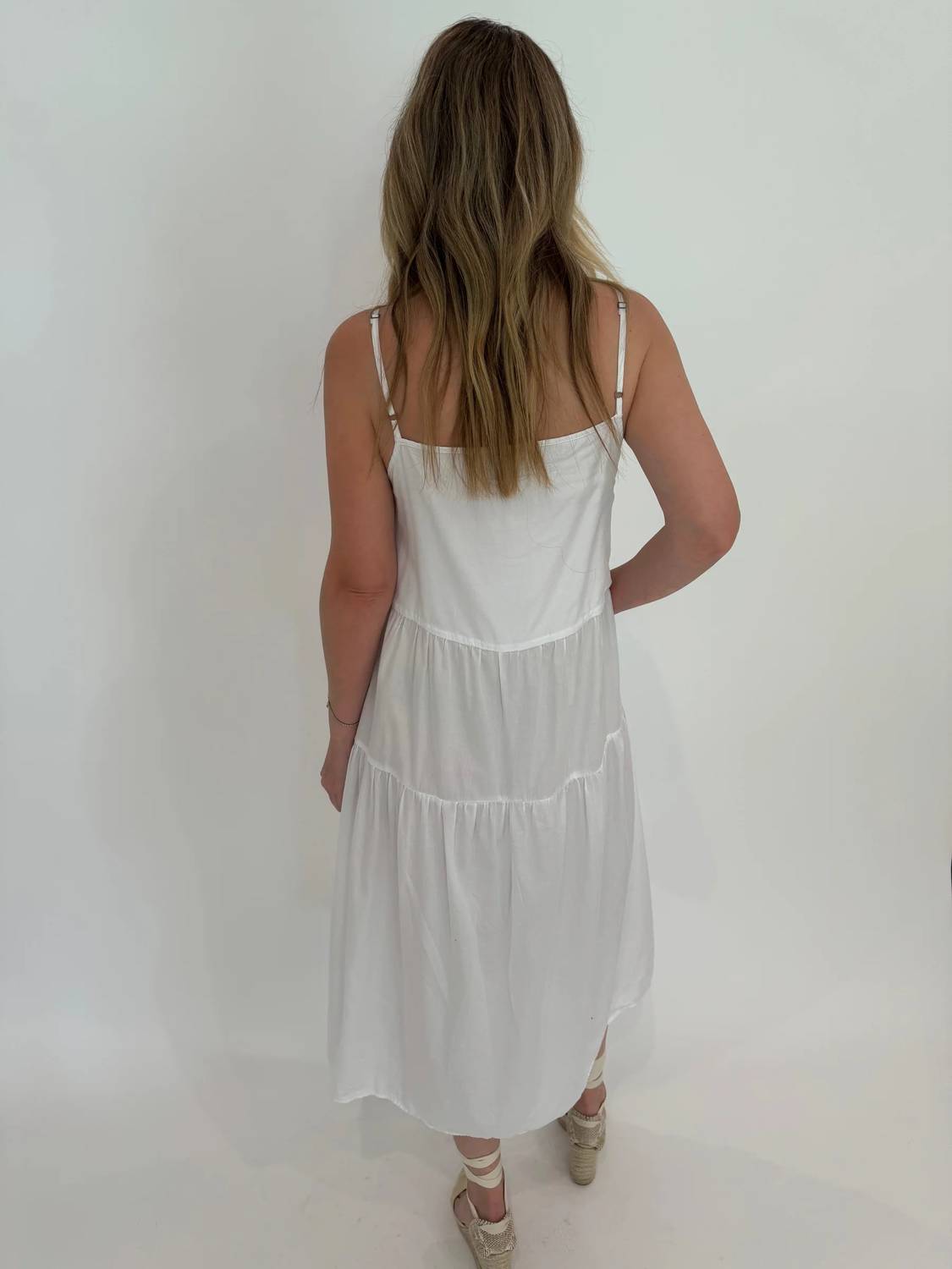 Um vestido midi tão versátil que suas opções de uso são infinitas. Descubra o Vestido Cool Cotton Strappy Tier da Enza Costa, uma opção chique e respirável para os dias quentes. Este vestido midi branco é sem mangas, tem decote quadrado e alças finas ajustáveis ​​para um ajuste personalizado. Confeccionado em algodão leve, oferece bolsos funcionais e corte em A, garantindo conforto e estilo. Fechamento: Puxe para vestir facilmente.