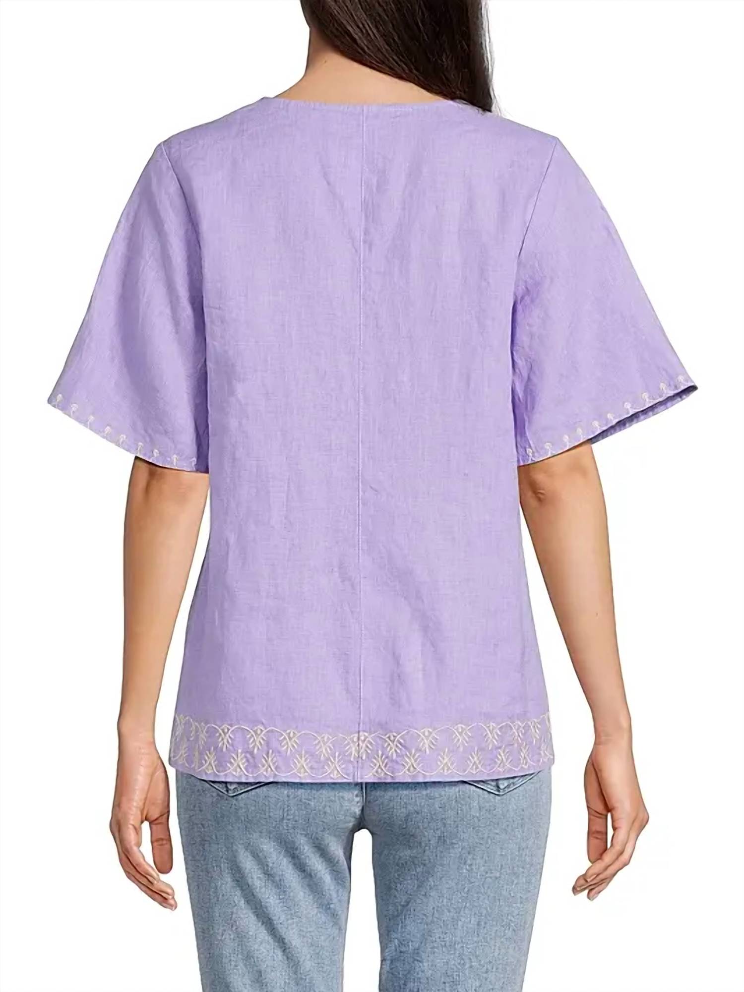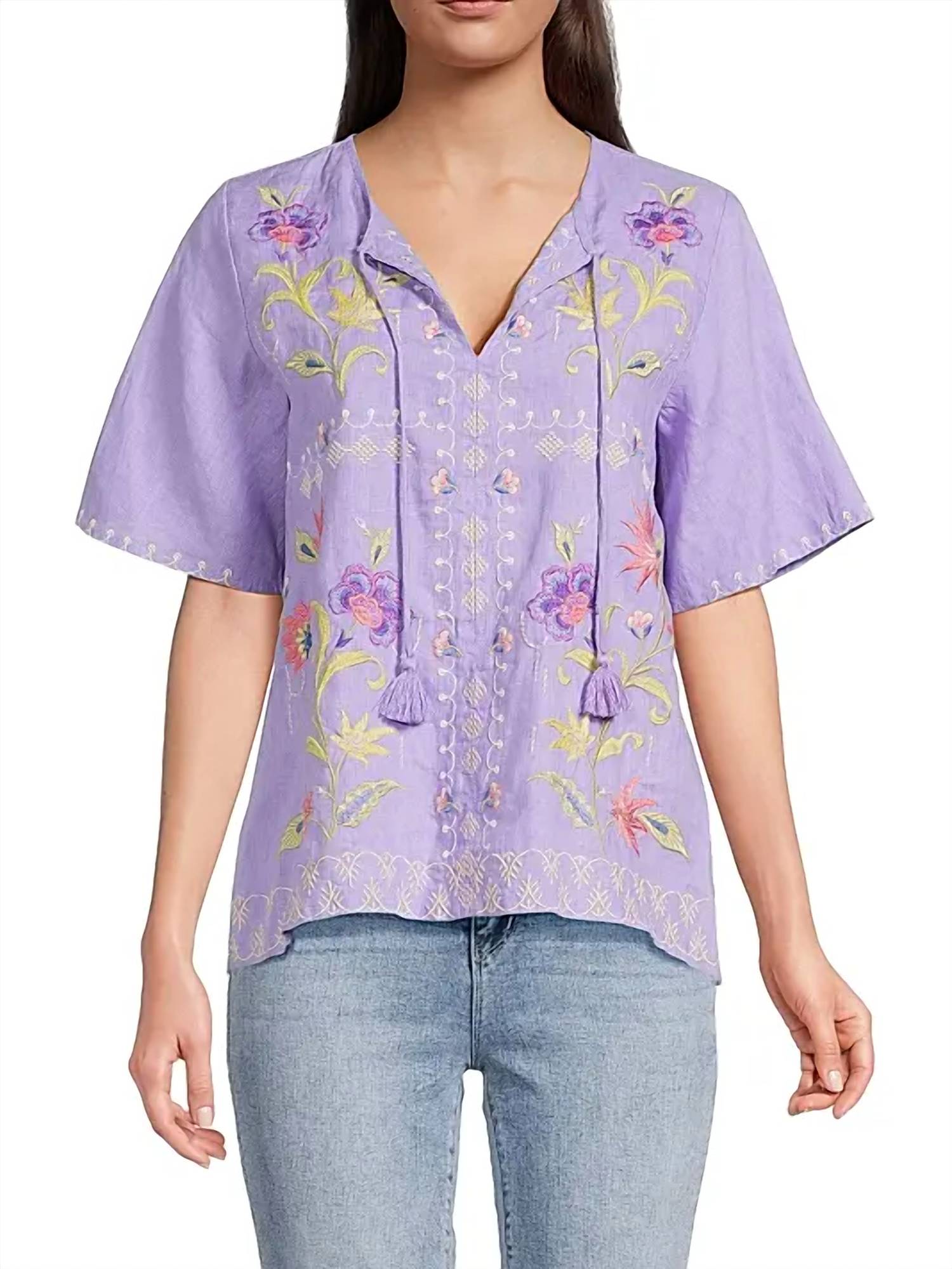 Uma blusa atemporal que nunca sai de moda. Abrace o espírito vibrante da Blusa Field com Mangas Babadas da Johnny Was no deslumbrante Roxo Bougainvillea, ideal para viagens de férias. Confeccionada em 100% linho, esta blusa apresenta mangas curtas com estampas florais e um decote em V charmoso. Com fecho pull-on, esta peça incorpora uma tendência maximalista perfeita para a primavera. Cuidados: Lavar somente à mão.