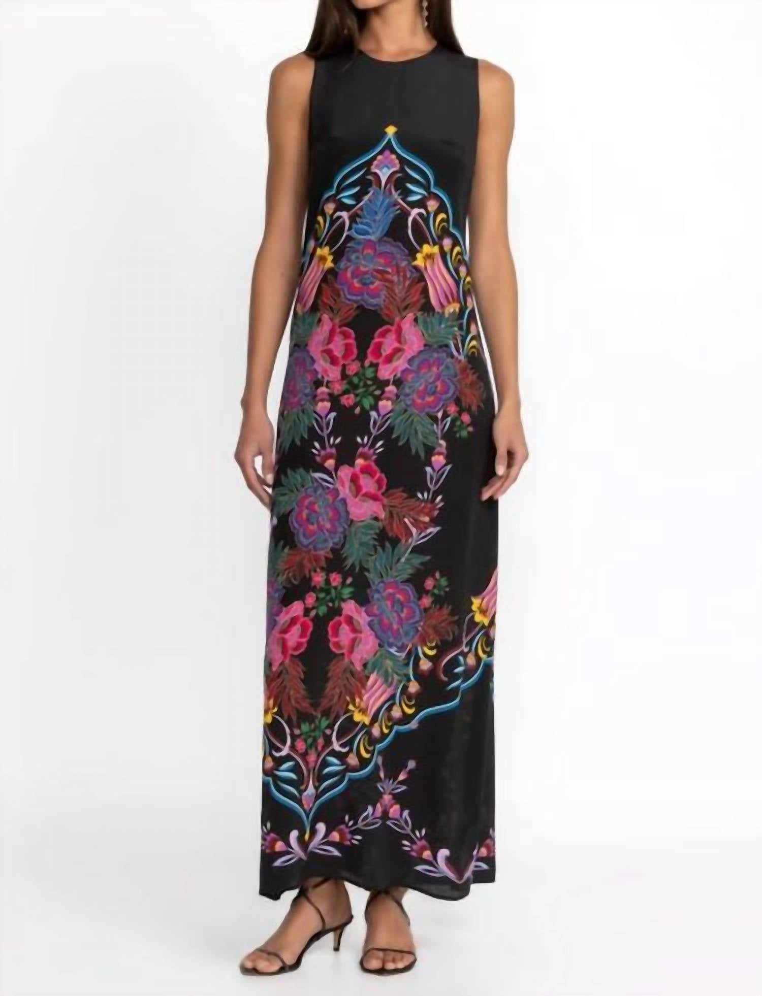 Um vestido longo que é tão fofo quanto confortável. O Vestido Longo Tatianna é uma peça deslumbrante adornada com um caleidoscópio vibrante de cores e estampas. Apresenta uma silhueta relaxada em corte A, confeccionada em uma mistura única de seda. Este vestido sem mangas tem decote redondo e costas abertas, tudo isso acentuado por um ousado desenho floral. Combine-o com sandálias e uma clutch vibrante para uma saída à noite com as amigas. 65% rayon 35% seda
