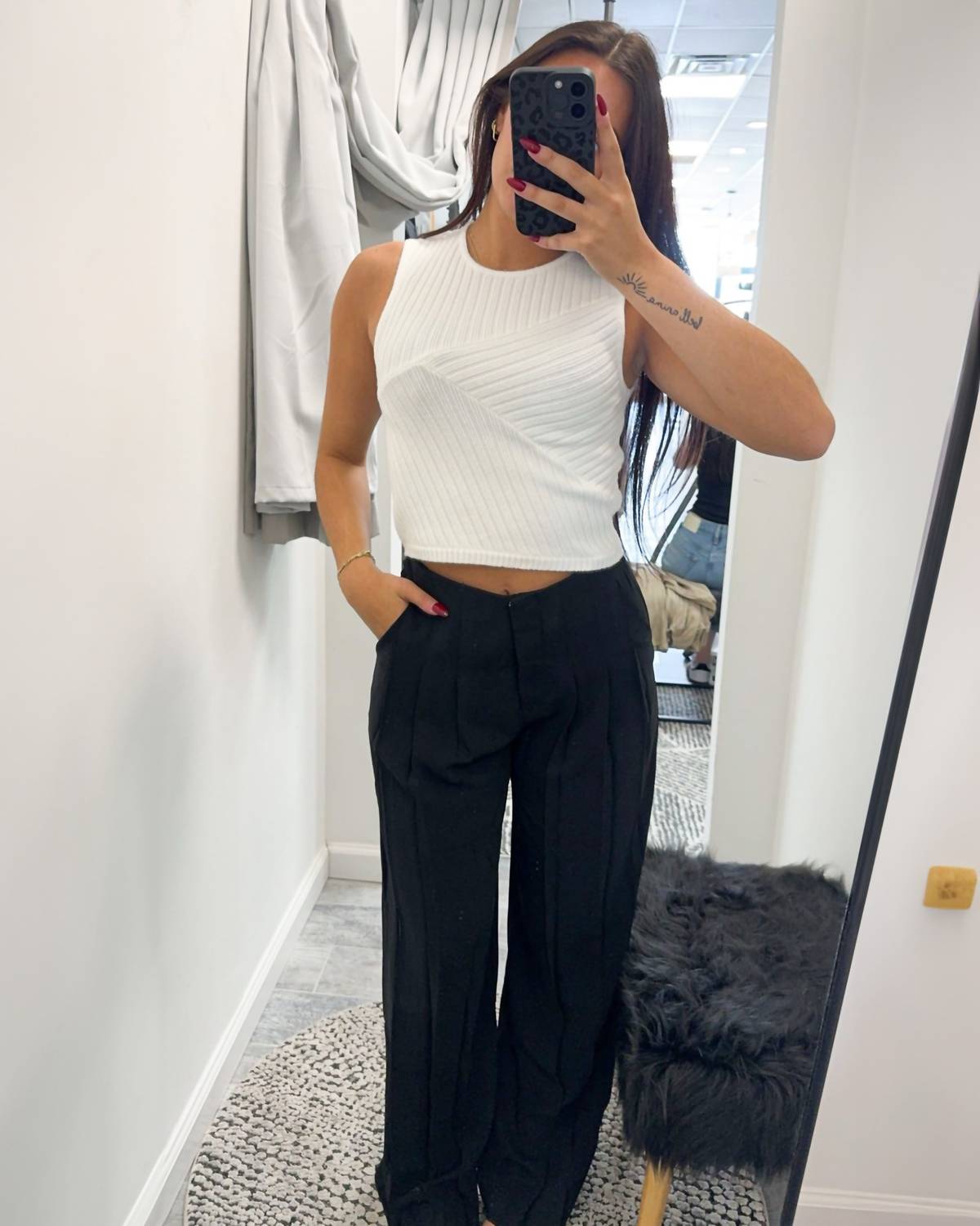 Eleve o seu look com a Calça Angelica da Steve Madden, uma combinação perfeita de conforto e estilo em preto sólido. Esta calça de perna larga apresenta cintura alta e pregas sob medida, proporcionando um caimento sofisticado e descontraído. Com 38 cm de altura, 78 cm de comprimento entrepernas e 47 cm de abertura nas pernas, ela pode ser usada em looks mais formais ou informais para qualquer ocasião. Combine com uma blusa justa para o escritório ou um top cropped para um look de formatura de verão. A modelo veste tamanho pequeno (altura de 1,78 m, busto de 86 cm, cintura de 63 cm, quadril de 91 cm).