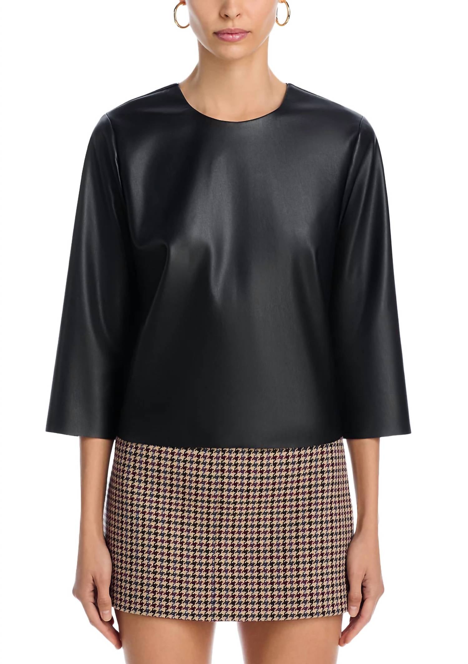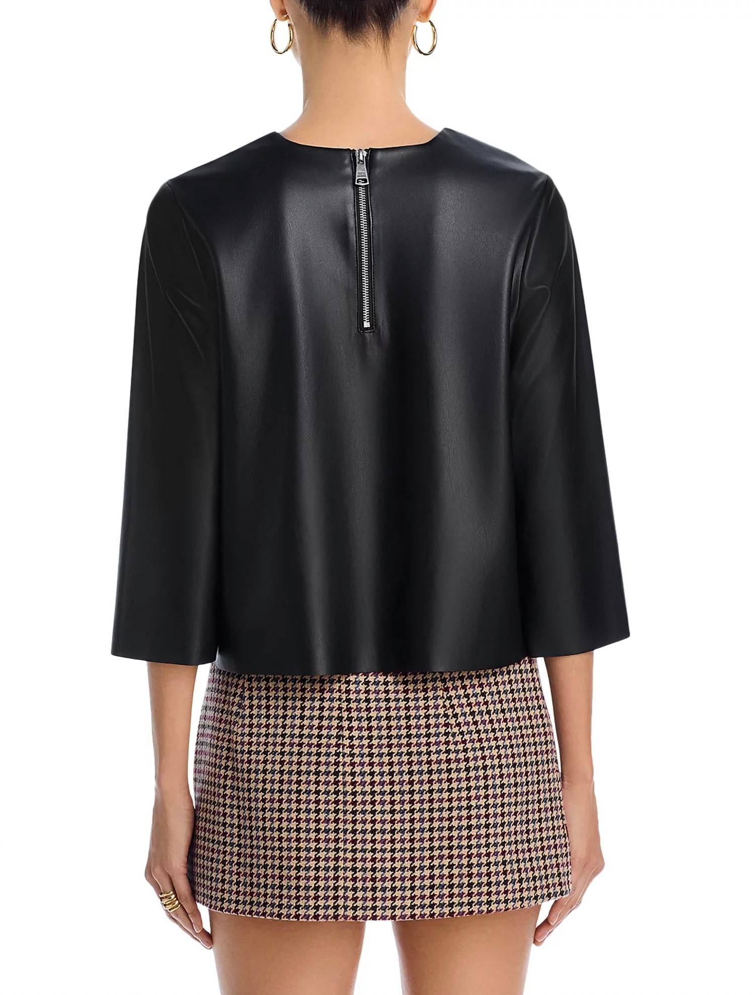 Blusa elegante e estilosa em couro sintético preto. Possui mangas três quartos, caimento justo de 56 cm e gola estilo joia para um visual elegante. Confeccionada em 100% poliuretano. Feita com zíper aparente nas costas para um uso sem esforço. Cuide desta peça seguindo as instruções de limpeza localizada para mantê-la impecável.