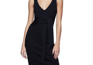 Vestido midi preto Good American, malha canelada com cintura amarrada, tamanho 001