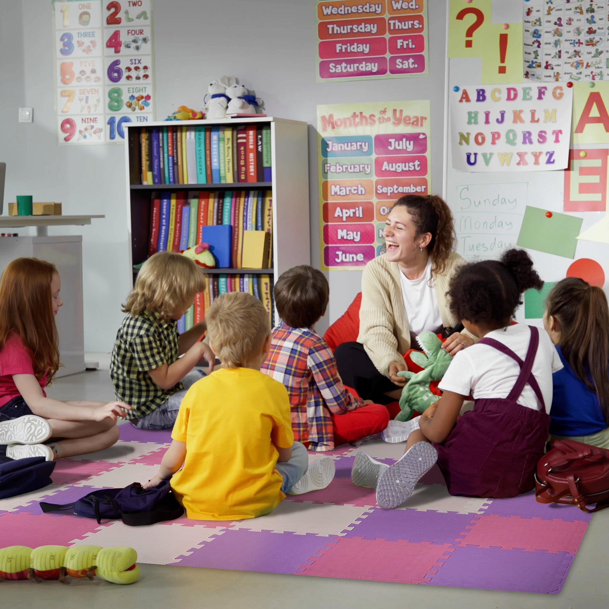- Com esquema de cores em rosa, roxo e bege, este pacote de tapetes interligados cobre até 16 pés quadrados de espaço de jogo, com cada peça medindo 1 pé quadrado