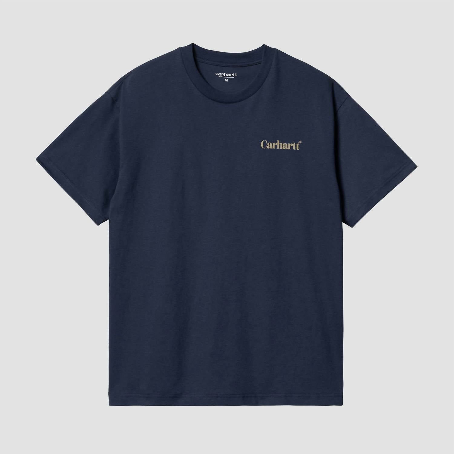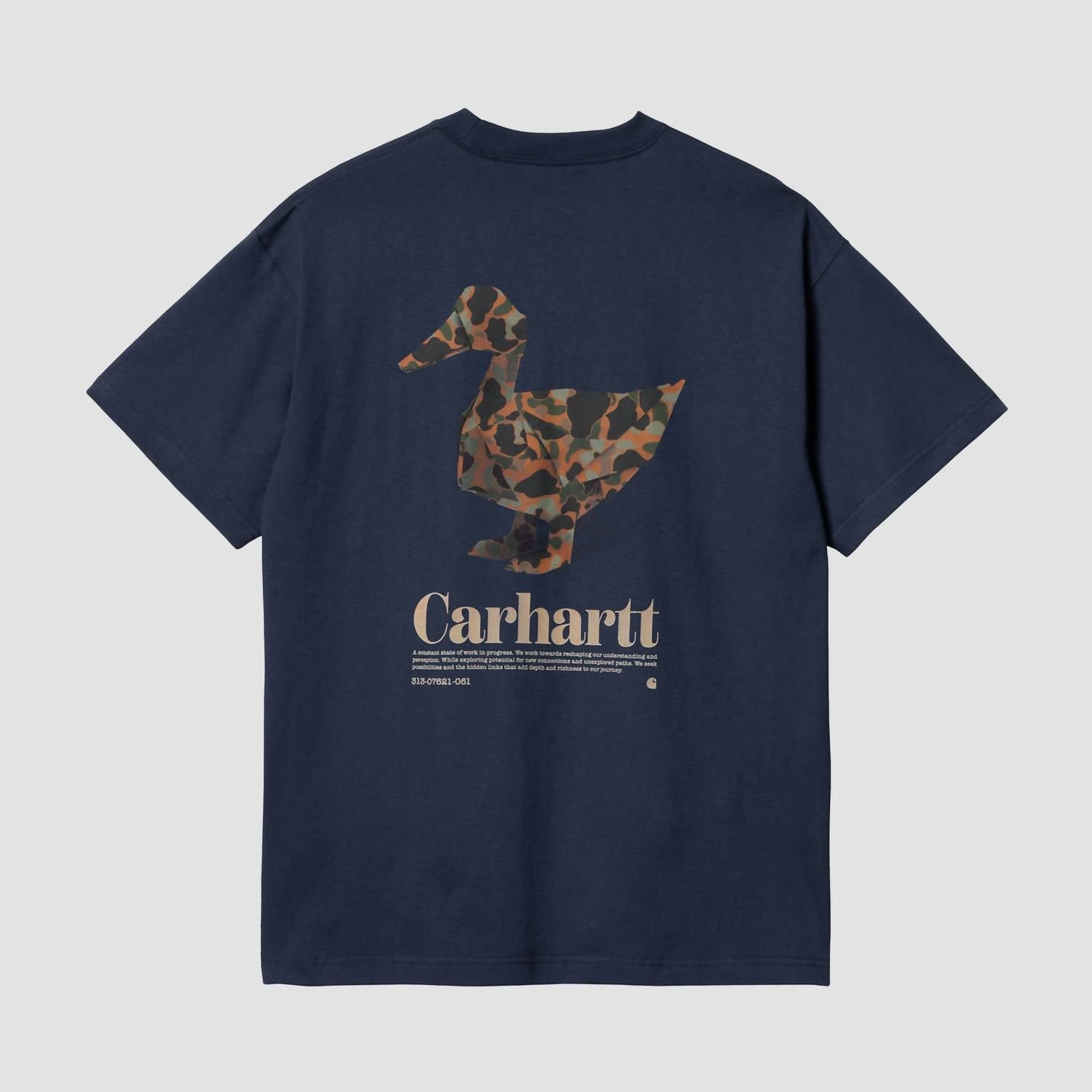 Introducing the Carhartt WIP Short Sleeve Fold Duck T-shirt in Air Force Blue, designed for the modern streetwear enthusiast. This tee is composed of 100% organic cotton and offers a loose fit for ultimate comfort. It showcases eye-catching graphic prints on both the chest and back, perfect for casual travel outings. Closure: Pull on. Care: Machine wash. Model's height is 183 cm and wears size M.