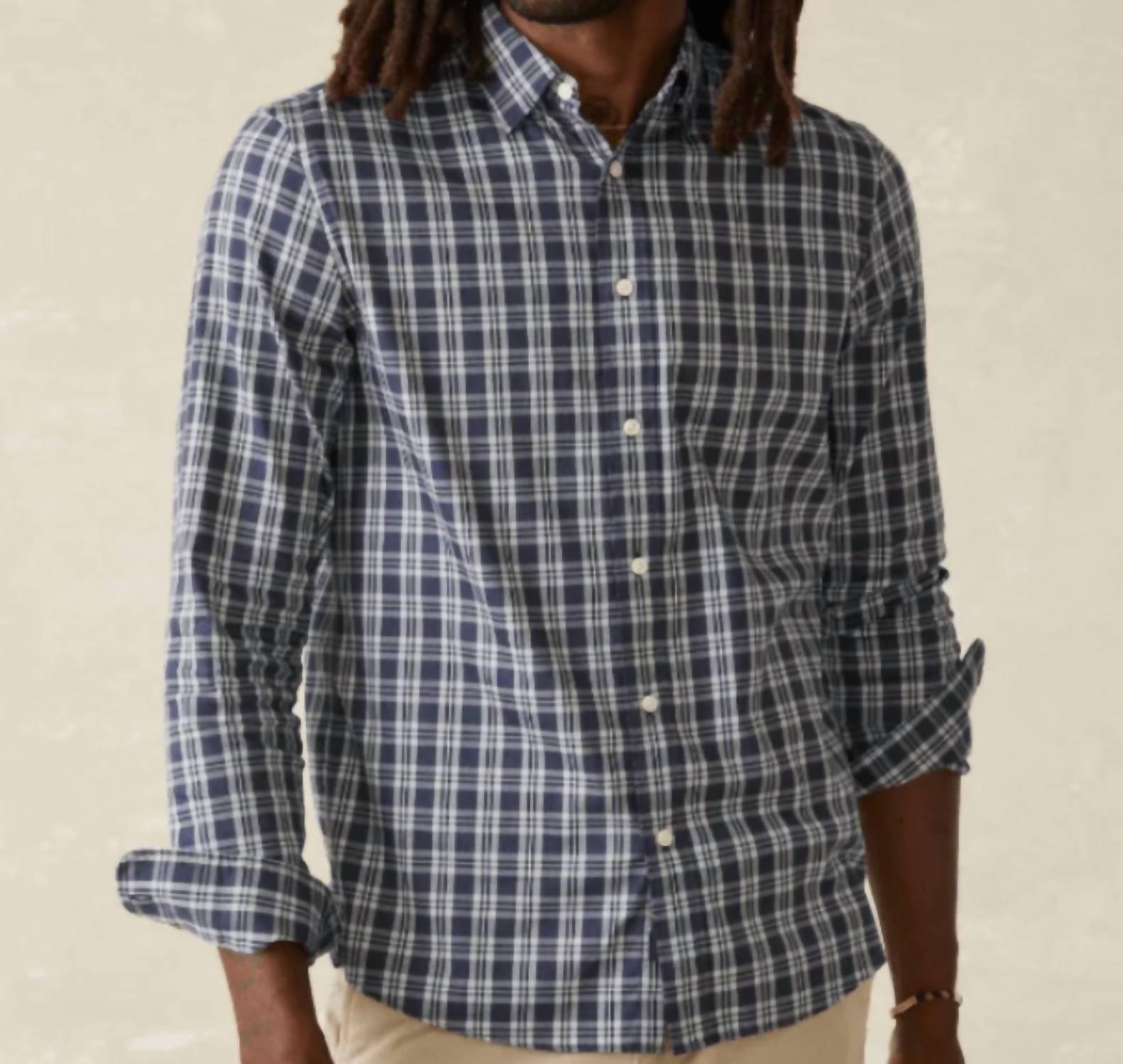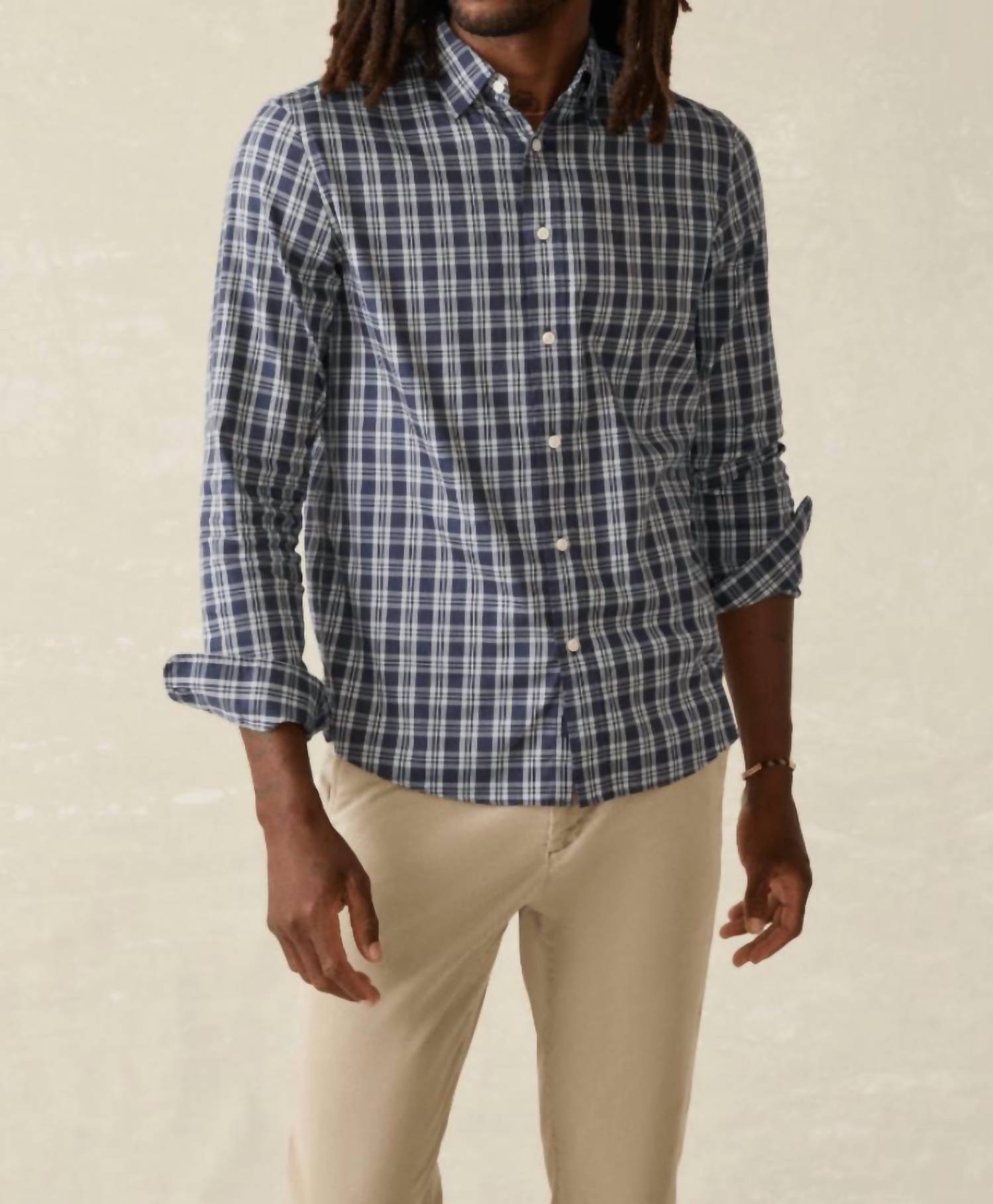 Introducing the Movement Shirt by Faherty in Starry Sky Plaid, a perfect blend of style and performance for the modern man. This men's shirt features long sleeves with button cuffs and a spread collar with concealed buttons to prevent fly-away. Made from a comfortable and stretchy fabric blend of 55% Supima Cotton, 16% Lyocell, 25% Recycled Nylon, and 4% Spandex, it is finished with a button closure and a shirttail hem for a refined look. Care instructions recommend turning inside out, machine washing cold on a gentle cycle, and tumble drying low.