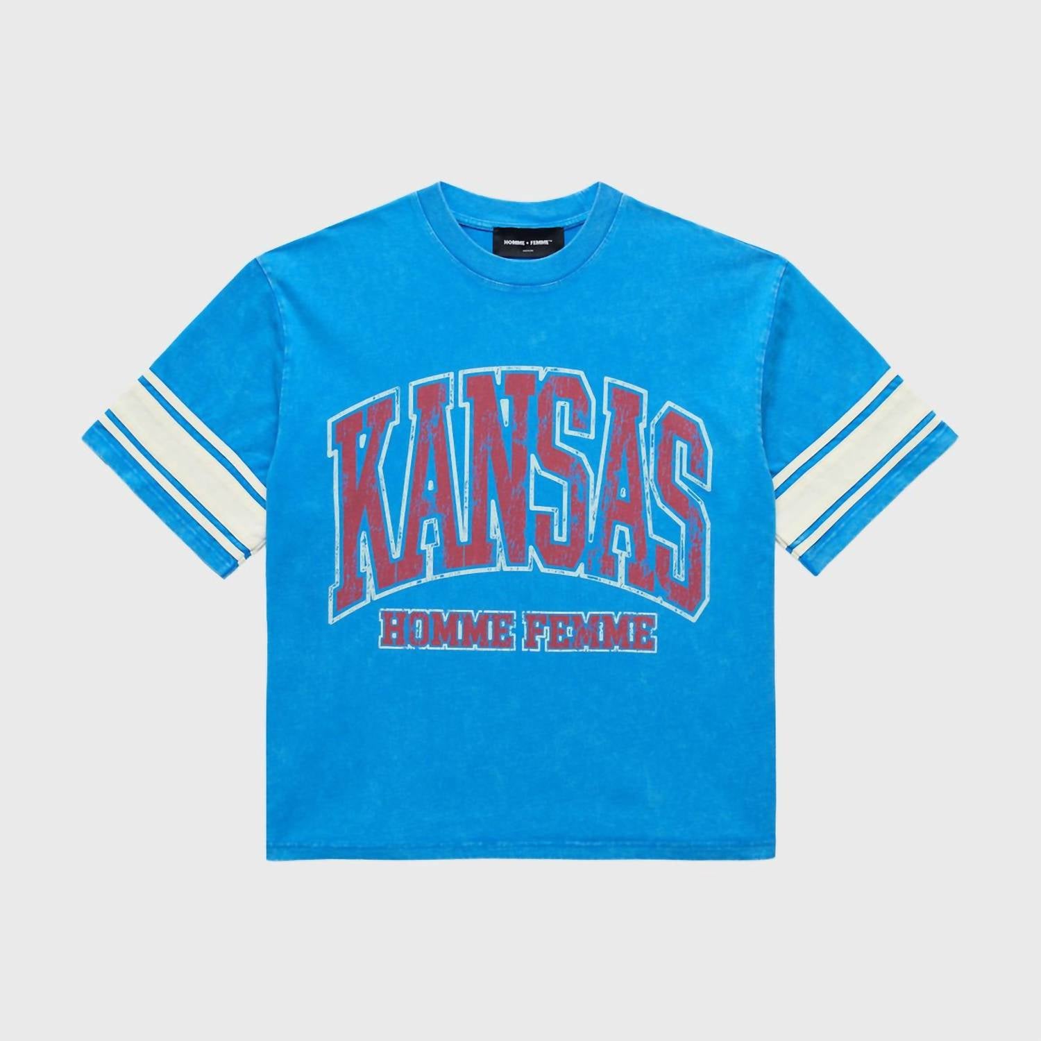 Unveiling the Kansas Cropped Tee by Homme + Femme, an iconic piece that blends heartland heritage with contemporary style. This tee features short sleeves with athletic stripes and a bold crewneck, made from heavyweight cotton in a vibrant vintage-washed blue. The boxy cropped silhouette proudly displays oversized varsity-style "KANSAS" lettering over the HOMME Femme logo. It's a pull-on design that's hand wash only and should be line dried.