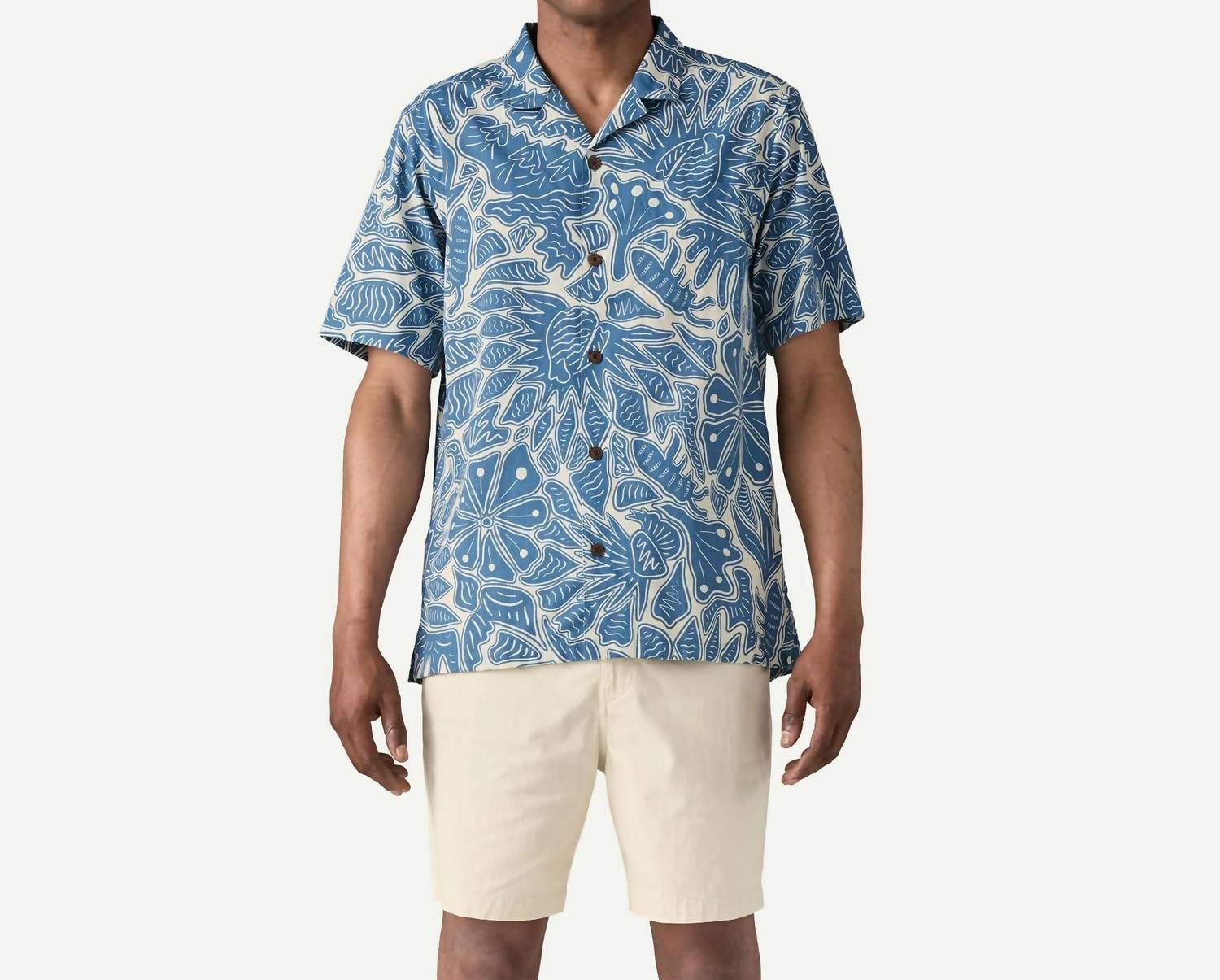 Introducing the Tidal Threads Camp Shirt by Patagonia, a stylish piece designed with a light and airy feel for your holiday gatherings. Crafted from 100% organic cotton, this patterned shirt features short sleeves and is adorned in a blue hue with a charming "Bees and Flowers" print. Originating from Vietnam and offering a practical button-front closure, it includes a convenient left-chest pocket. This shirt is produced in a Fair Trade Certified™ factory, ensuring fair wages for the artisans.