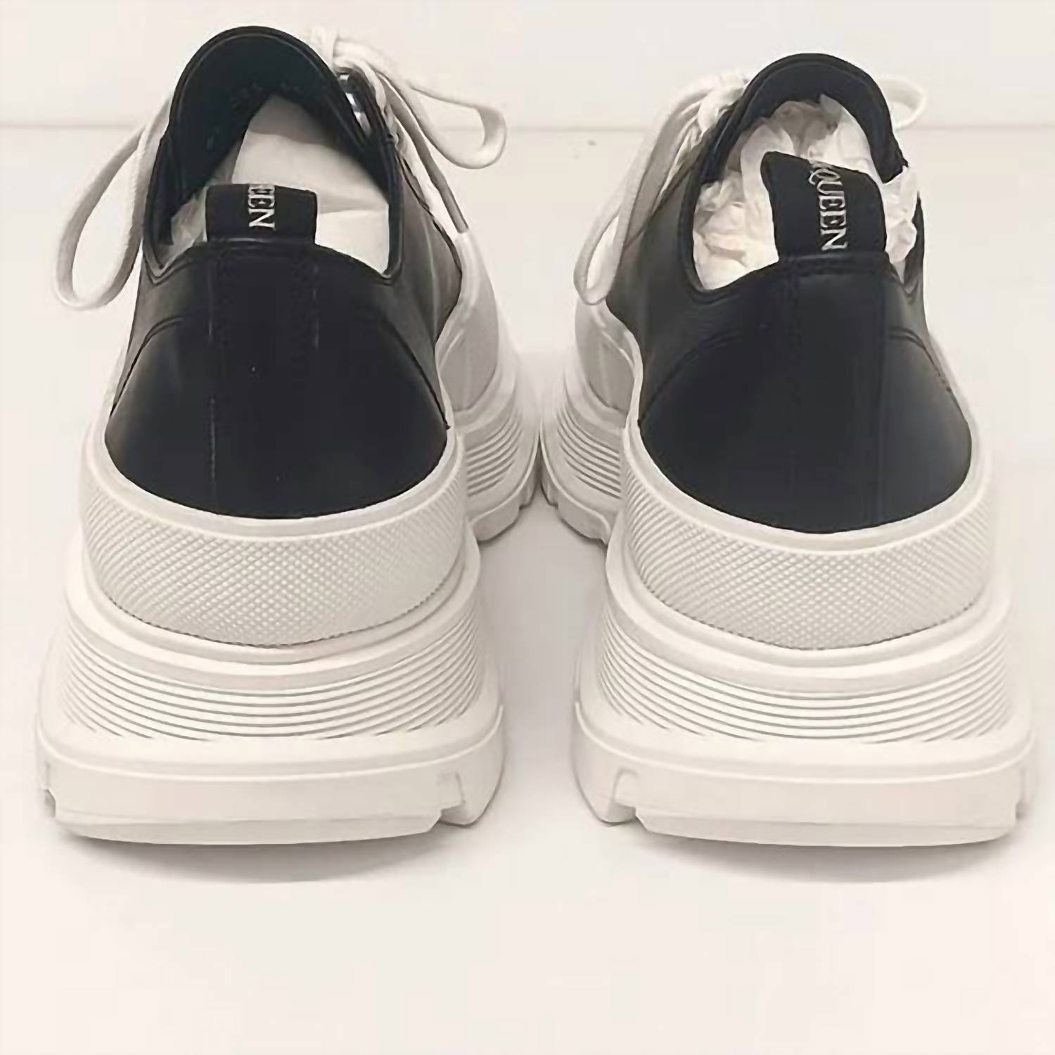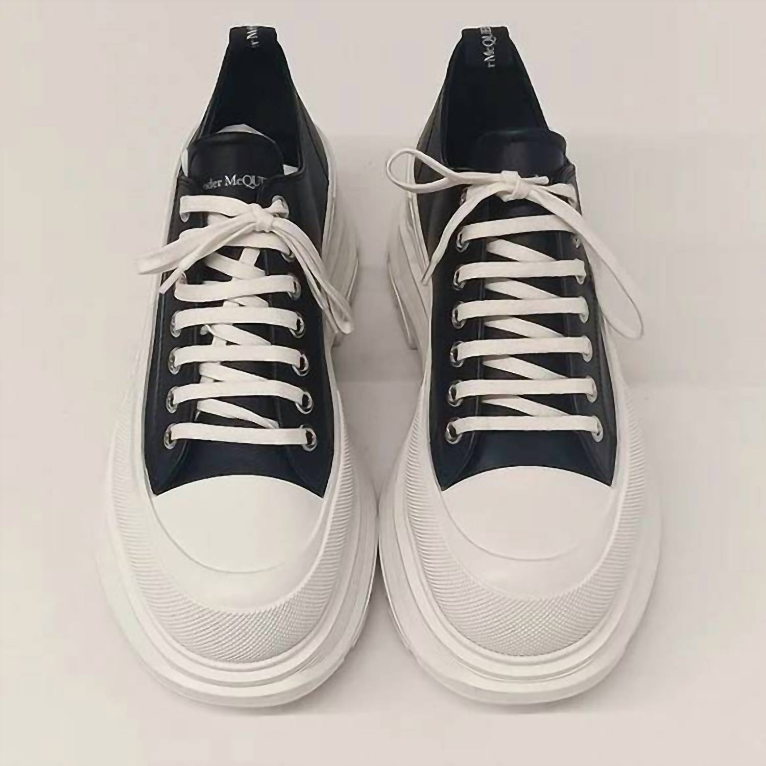 Step into bold, modern style with this low-top black and white lace-up sneaker. Crafted from durable black canvas, this shoe features a chunky, oversized rubber tread sole for a striking silhouette and added traction. A textured rubber wrap and tonal Alexander McQueen signature elevate the design, while the signature ribbon at the heel adds a touch of brand distinction. Finished with a classic round toe and a structured rubber toe cap, this sneaker seamlessly blends edgy aesthetics with everyday comfort.
