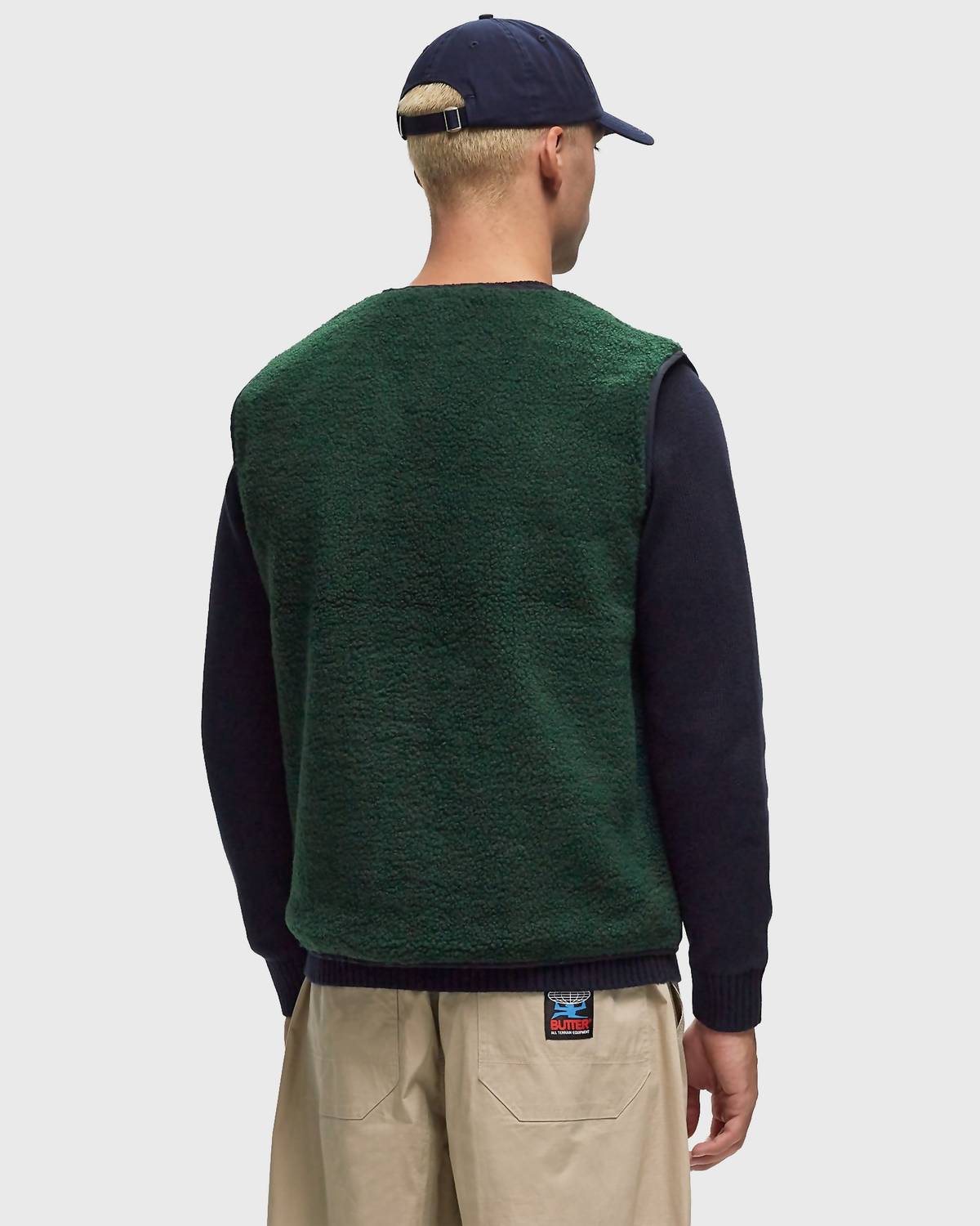 Presenting the Shearling Vest by Edmmond Studios, a stylish and minimalist choice for the spring season. This sleeveless vest in dark green is crafted from 100% polyester with a solid pattern, featuring a crewneck and a frontal metallic zip closure. Designed without a lining, it includes two pockets for convenience. Care: Machine wash and tumble dry.