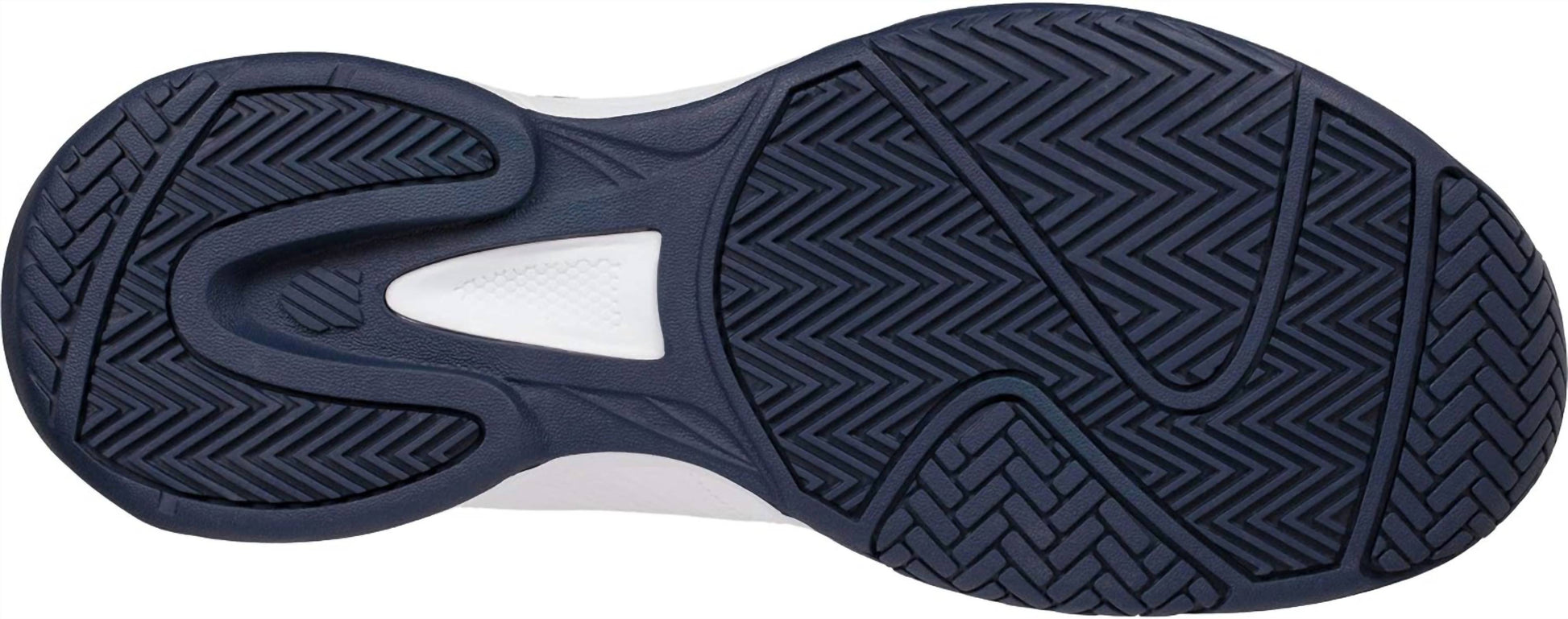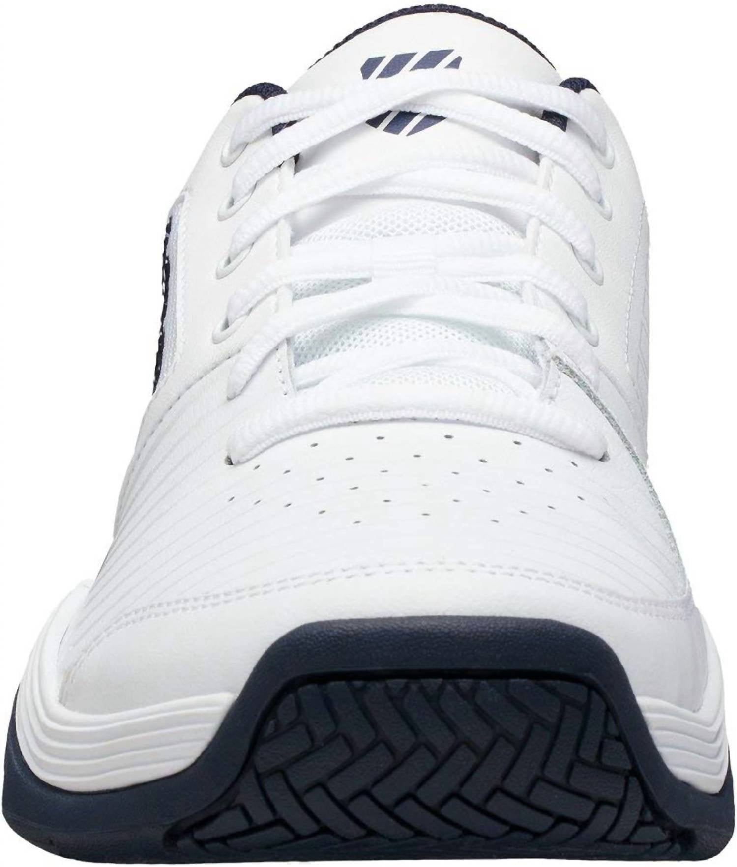 Experience superior comfort and support with the Men's Court Express Tennis Shoe by K-Swiss, ideal for developing or part-time players. Imported and crafted with a durable leather upper, this shoe features a rubber sole and a high-density AOSTA II rubber compound for lasting durability. The K EVA midsole offers maximized cushioning for enhanced performance, complemented by a polyurethane foam sock liner and a textile collar lining. Designed in a versatile white/navy color with a round toe shape, this sneaker is perfect for summer occasions with a preppy trend appeal.