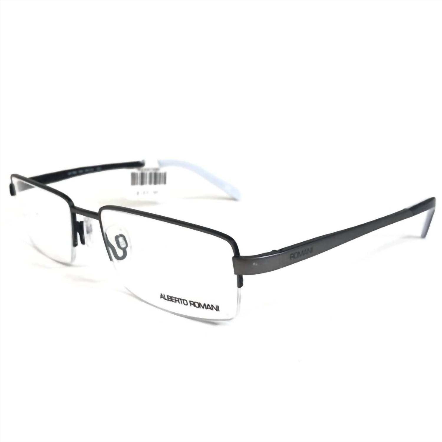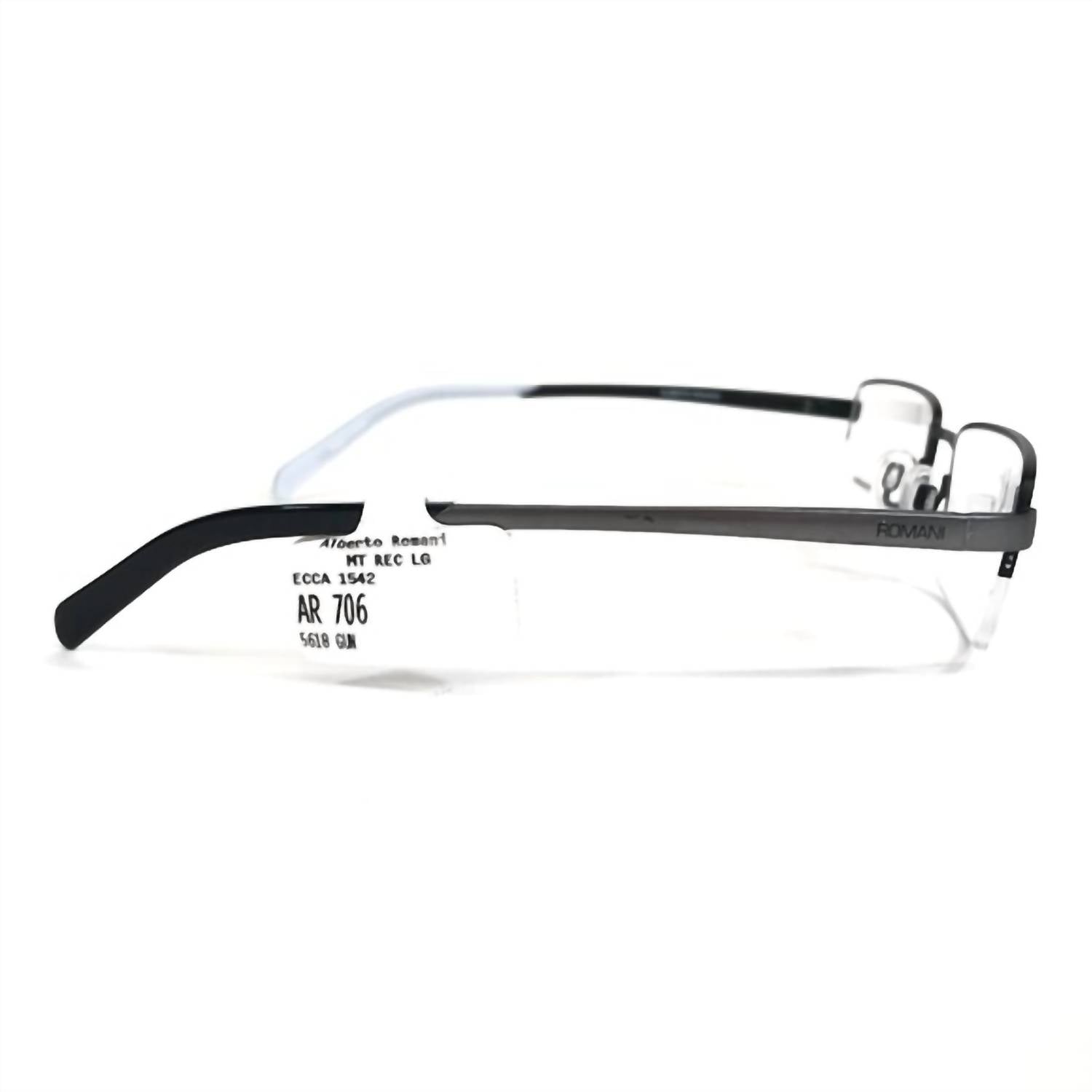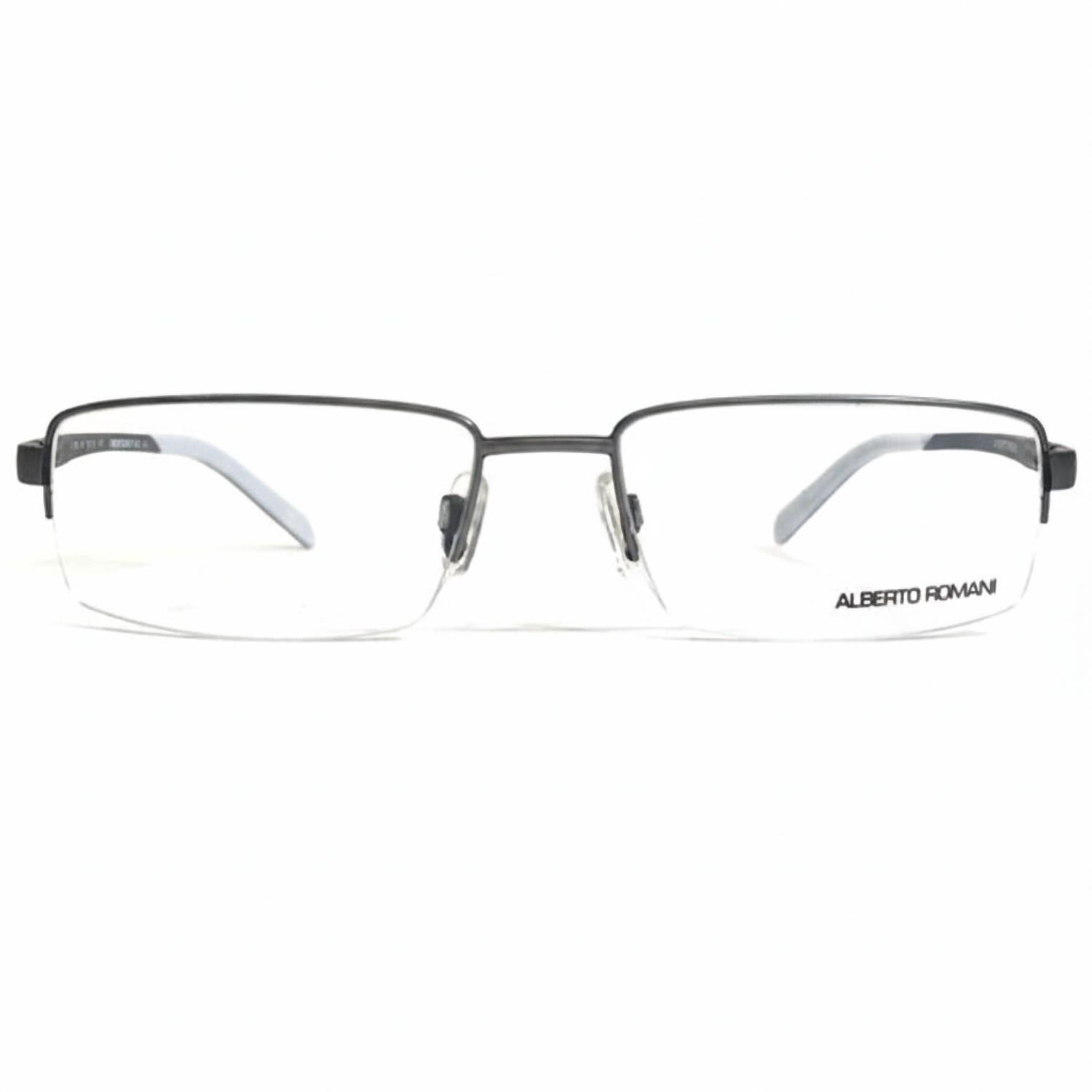 Discover the Men's Ar 706 Eyeglasses by Alberto Romani, showcasing a sophisticated frame in a gunmetal rectangle design. These half-rim sunglasses feature a robust frame made from metal, ensuring durability and style. Frame dimensions include a bridge width of 18mm, lens width of 56mm, and a temple length of 140mm for a comfortable fit. Ideal for adding a refined touch to your eyewear collection.