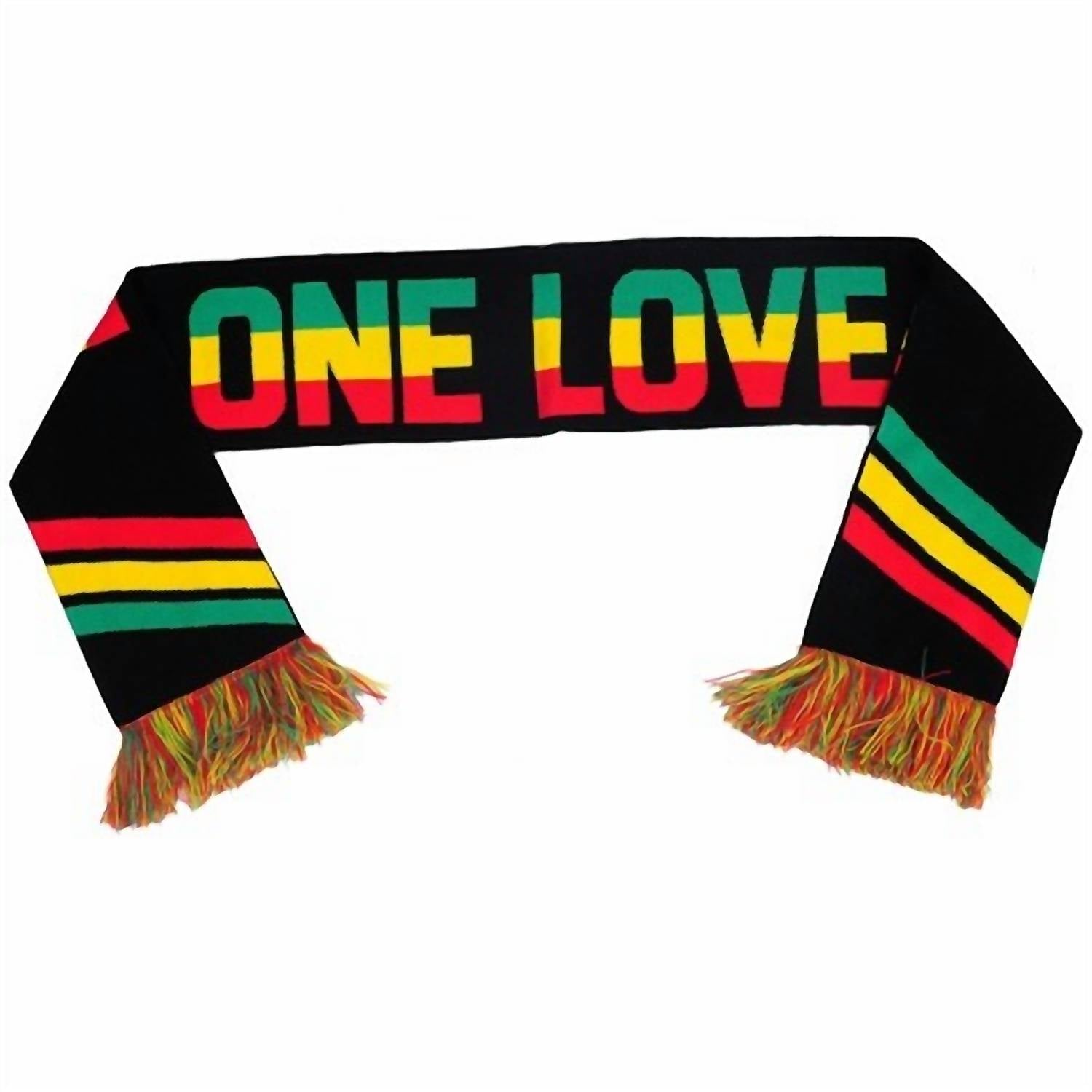 The Men's One Love Scarf by Bob Marley is a vibrant accessory showcasing iconic Rasta colors and themes. Crafted from 100% acrylic, this scarf is both eye-catching and warm, featuring bold "Bob Marley" lettering alongside diagonal stripes. Measuring 6 inches wide by 5 feet long, it also displays the words "One Love," a Rasta peace sign, and the Lion of Judah with a flag.