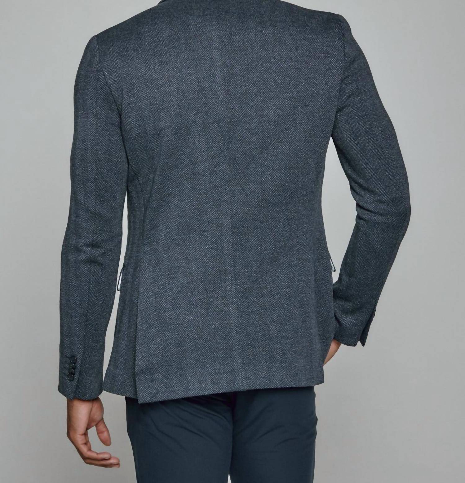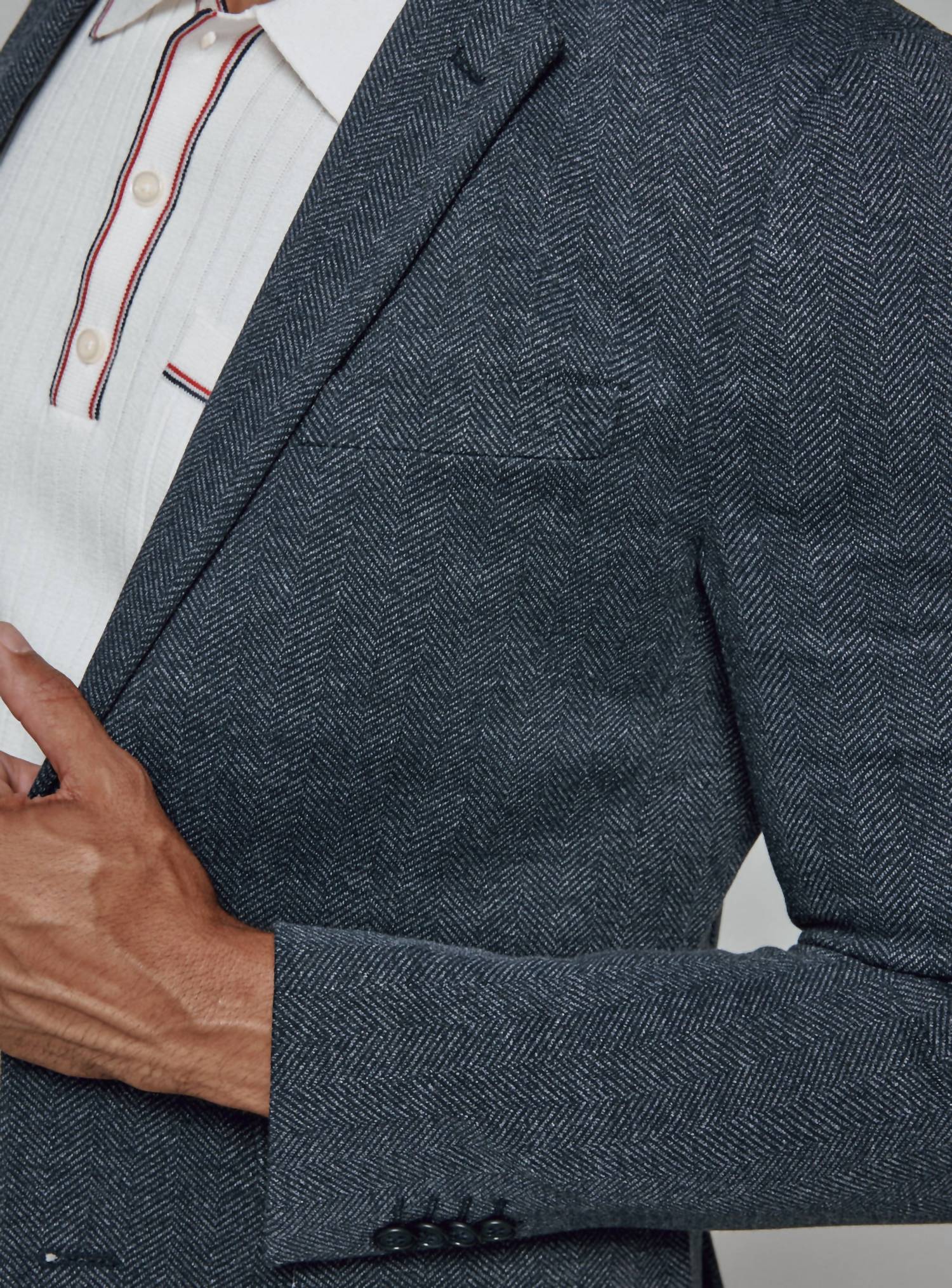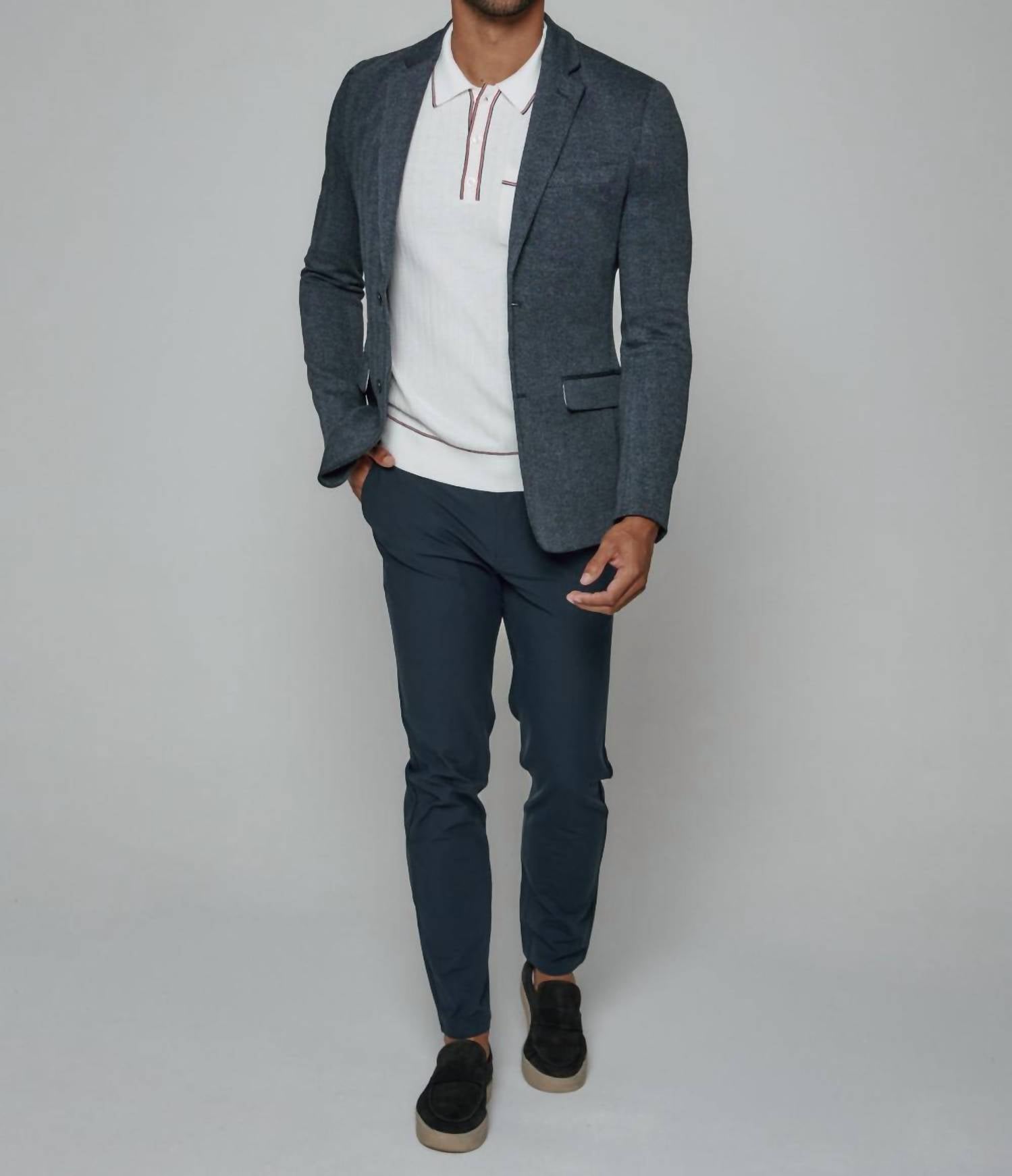 Introducing the Benjamin Blazer by 7 For All Mankind, a sophisticated navy piece perfect for any dinner party or preppy spring ensemble. This long sleeve blazer is crafted from a cotton blend composition of 66% Cotton, 31% Polyester, and 9% Spandex, offering a soft touch and lightweight feel. Featuring a timeless herringbone pattern, it is finished with premium horn button closure and a collar neckline. Care for this lined blazer by opting for dry cleaning only, and pair it seamlessly with your favorite chinos and loafers for a polished look. Model is 6'1" and wearing a size medium.