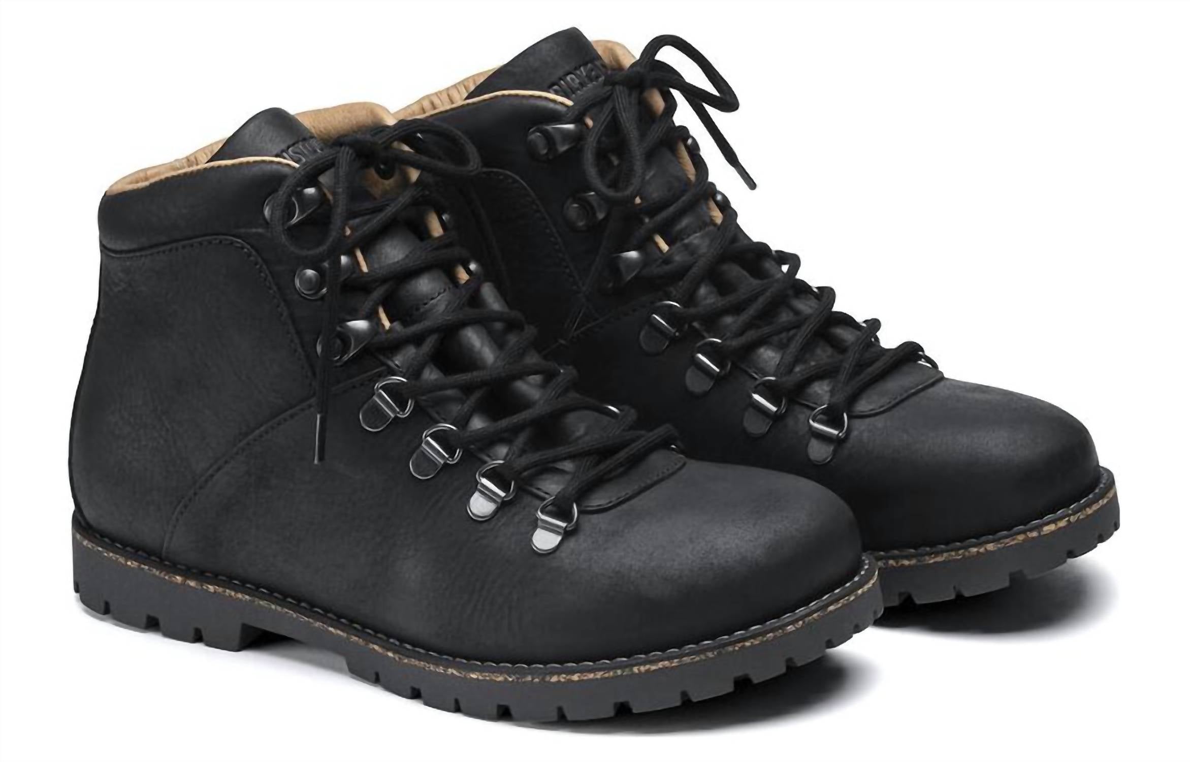 Experience the combination of comfort and style with the Men's Jackson Nubuck Leather Shoes by BIRKENSTOCK. Crafted with an upper of oiled nubuck leather, these boots offer a smooth leather lining for exceptional comfort. The removable, anatomically shaped cork-latex footbed is 'Made in Germany' and sits on a lightweight synthetic sole. Perfect for a regular fit, these black boots are the epitome of premium craftsmanship.
